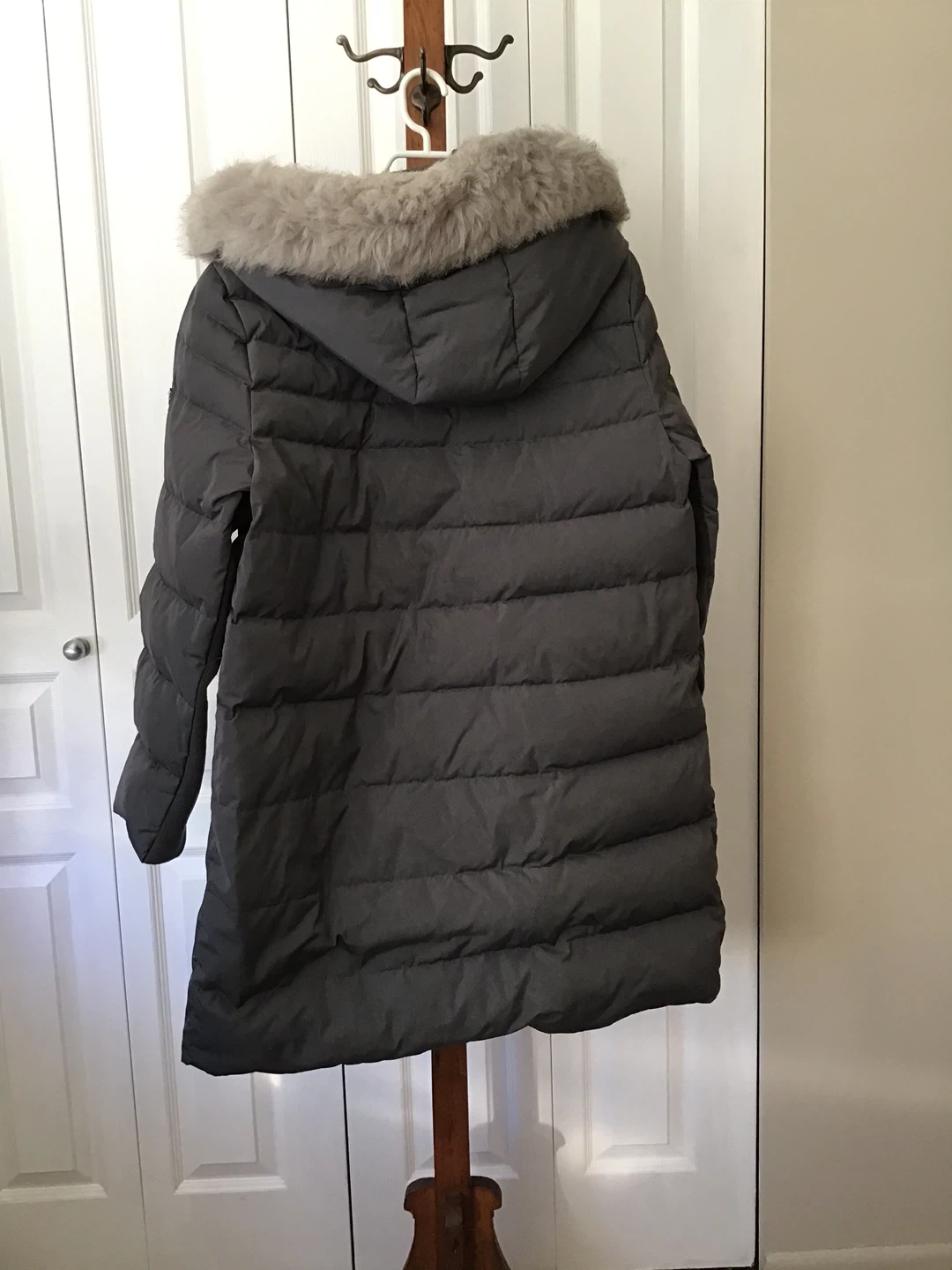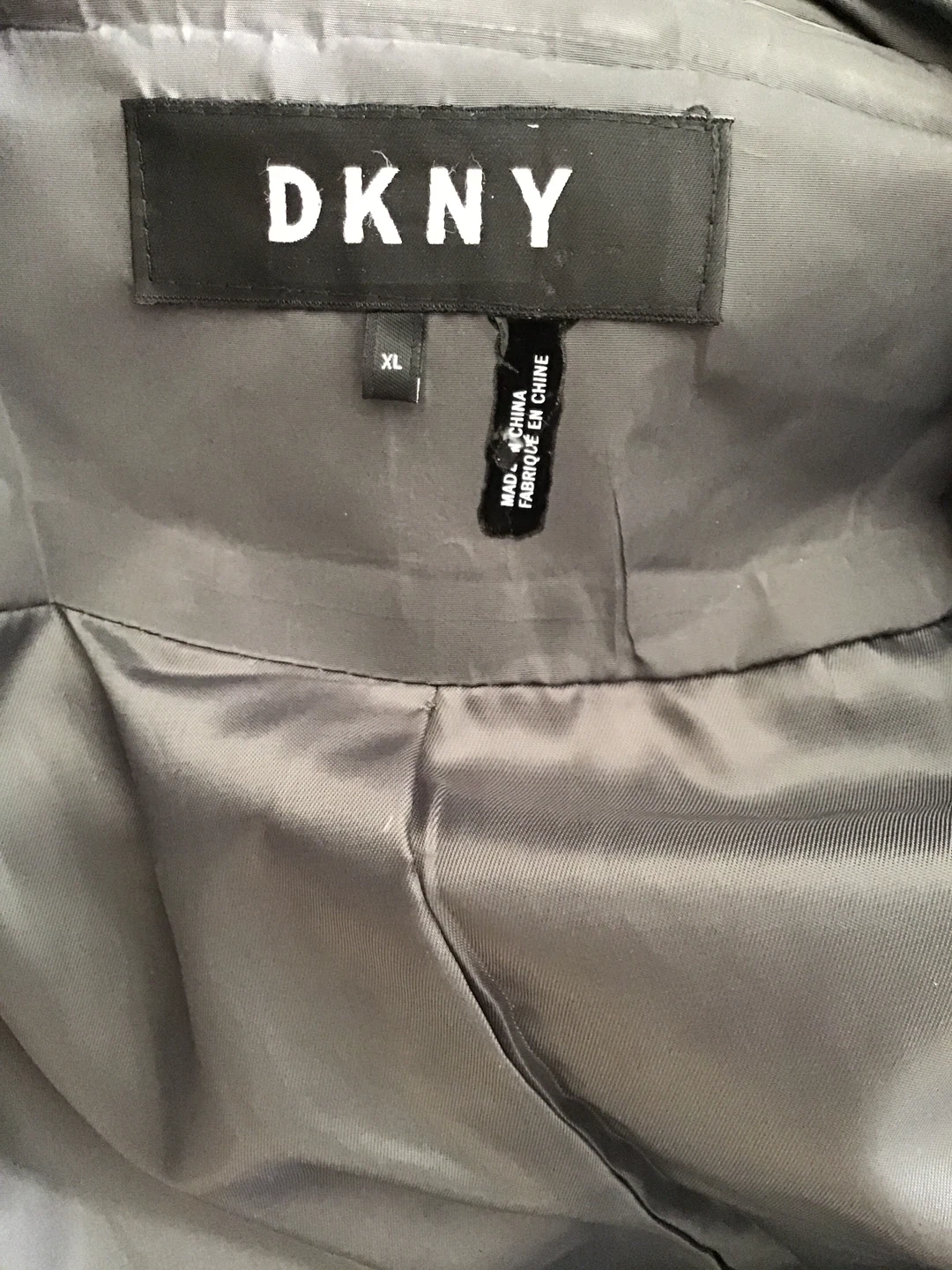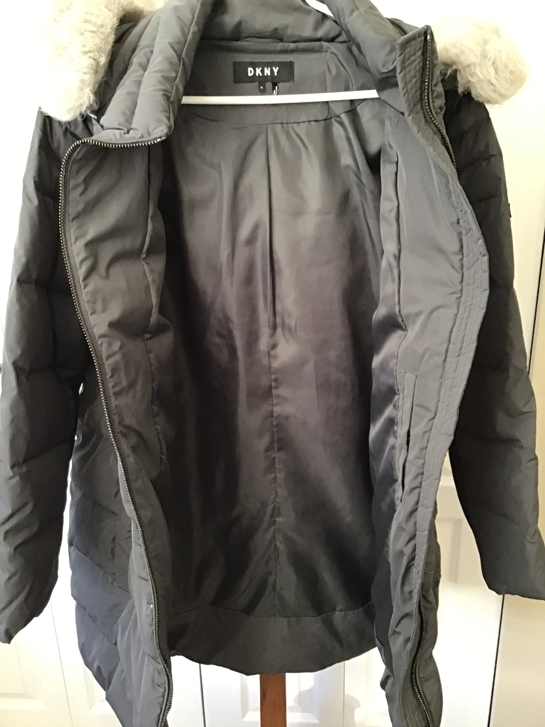 Selling a DKNY puffer coat in size XL. It's a stylish grey colour and features a faux fur hood trim. Perfect for staying warm this winter!