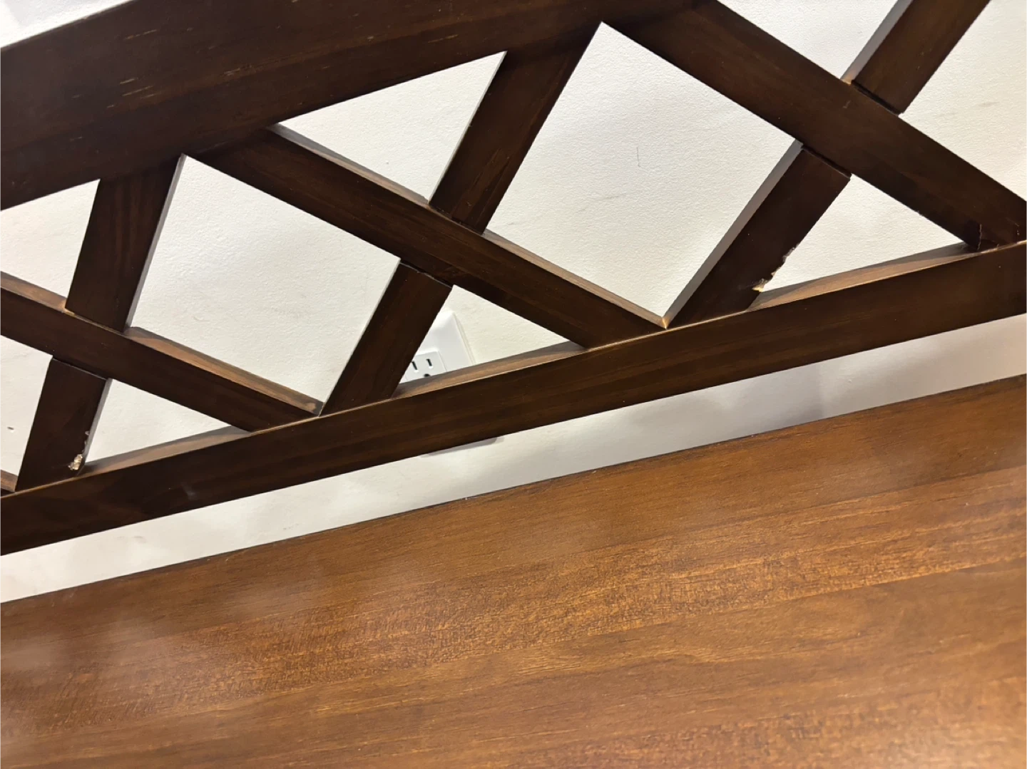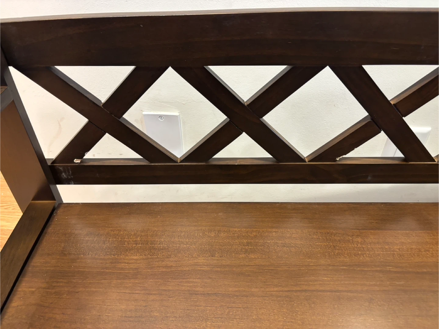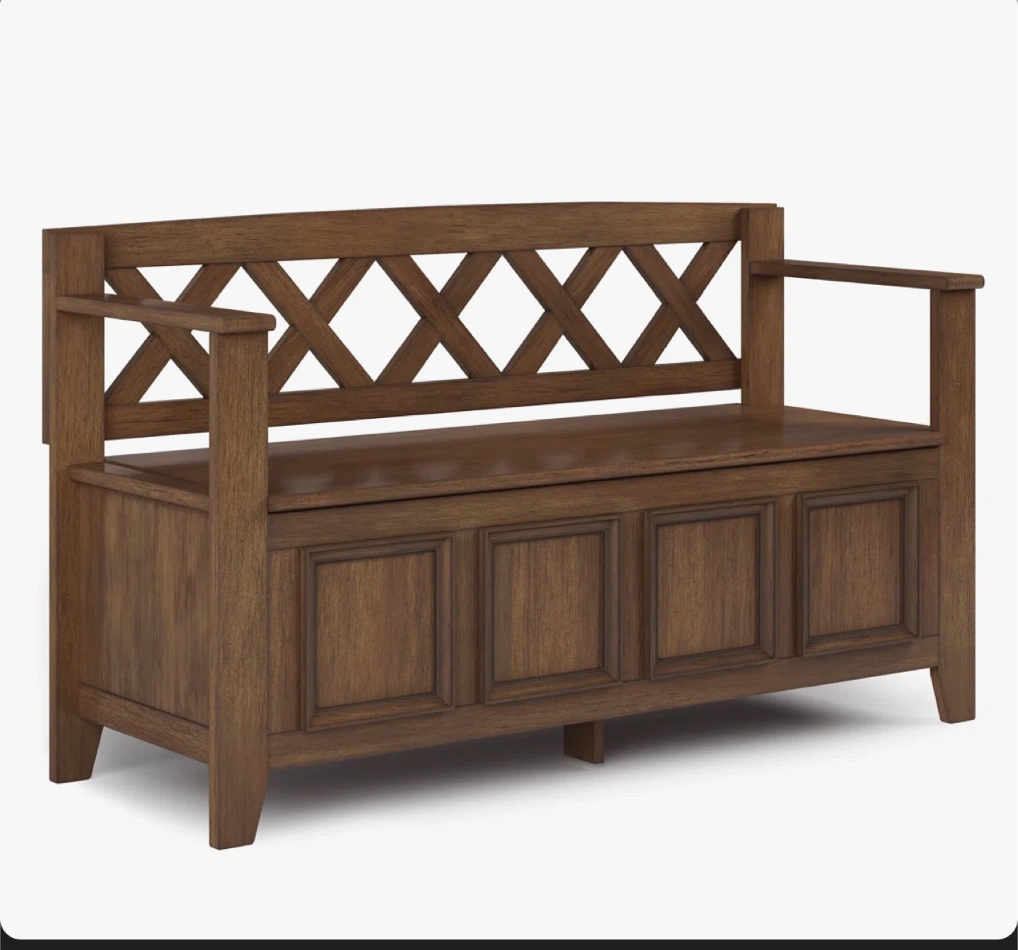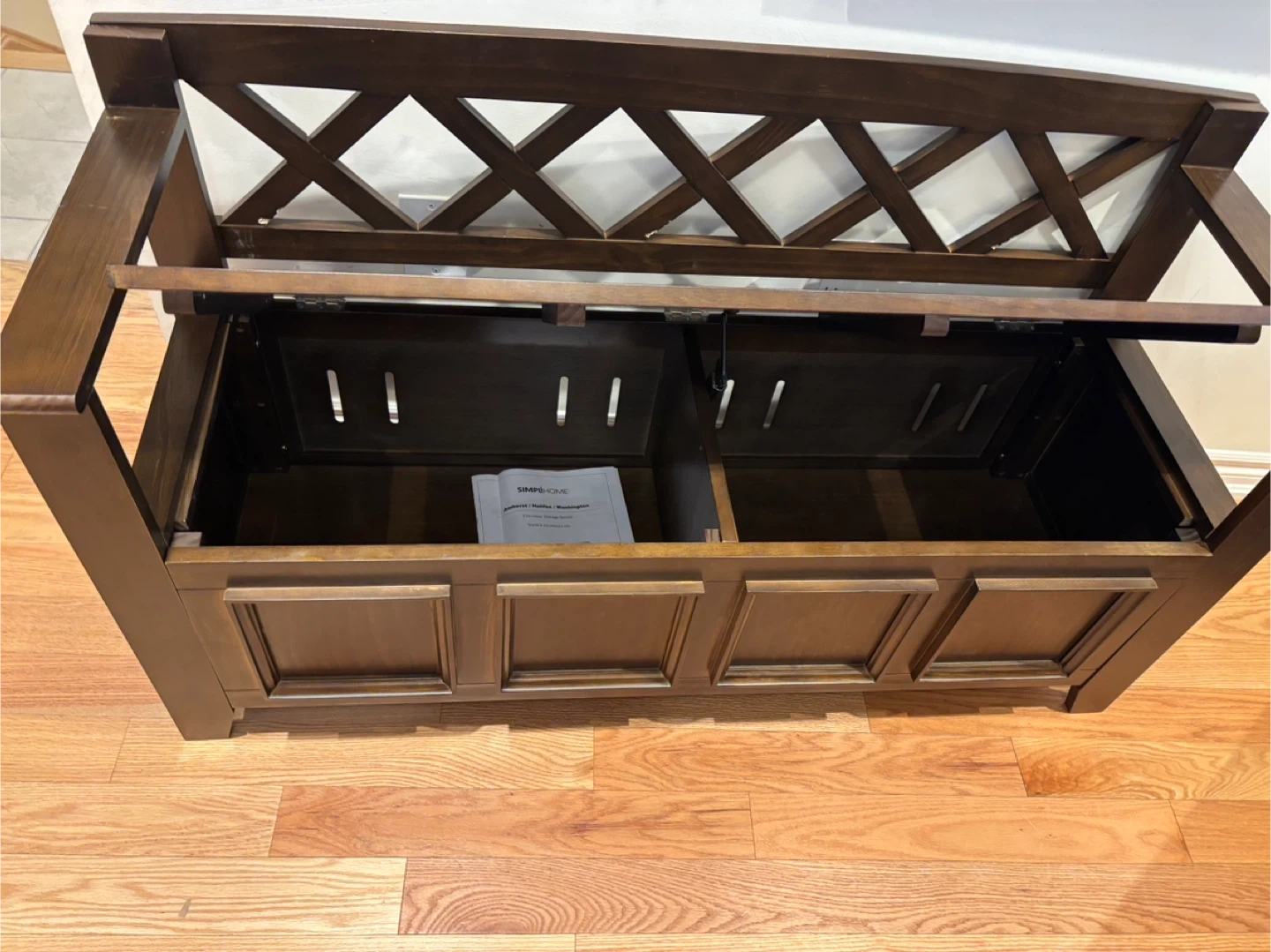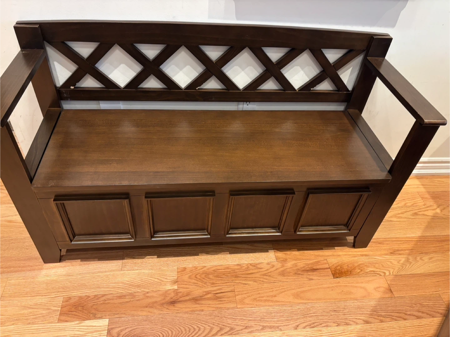 This wooden storage bench features a lift-top lid and dual compartments for ample storage. It's crafted from solid wood with a rich brown finish. The lattice back design adds a stylish touch to any entryway or mudroom.its new. Gotten from an auction site . Had a little chip during assembly.