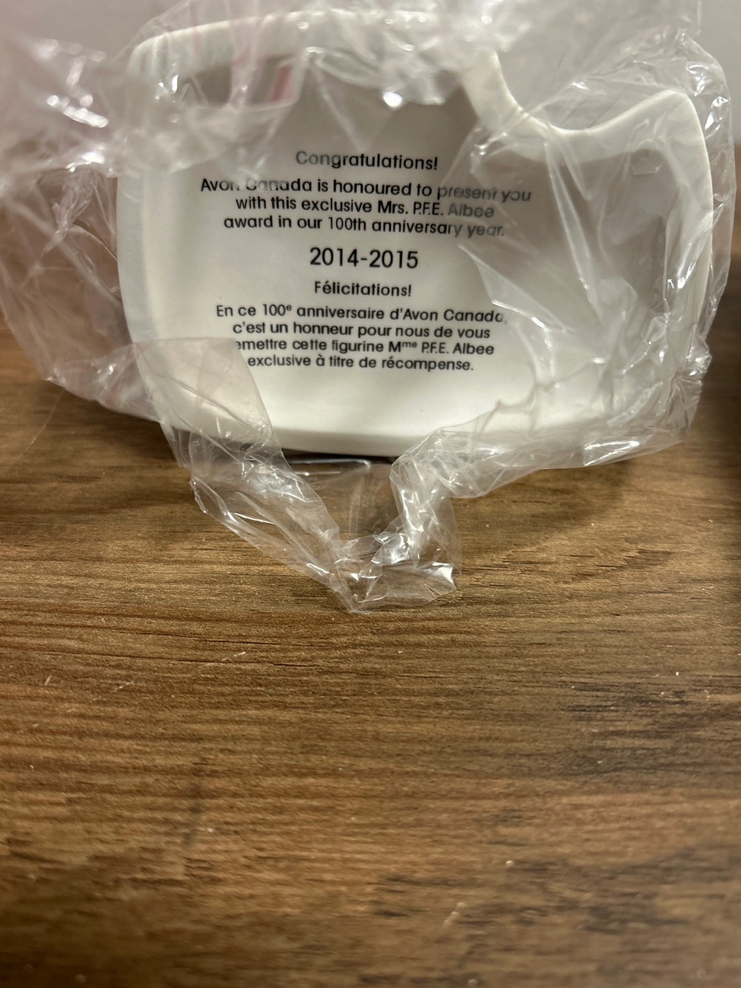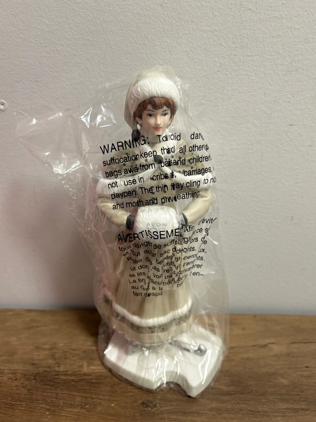 This is an Avon President's Recognition Award figurine from the 2014-2015 year. It commemorates Avon Canada's 100th anniversary. The figurine depicts a woman in winter attire, holding a muff with 'Avon 100 Canada' printed on it.
