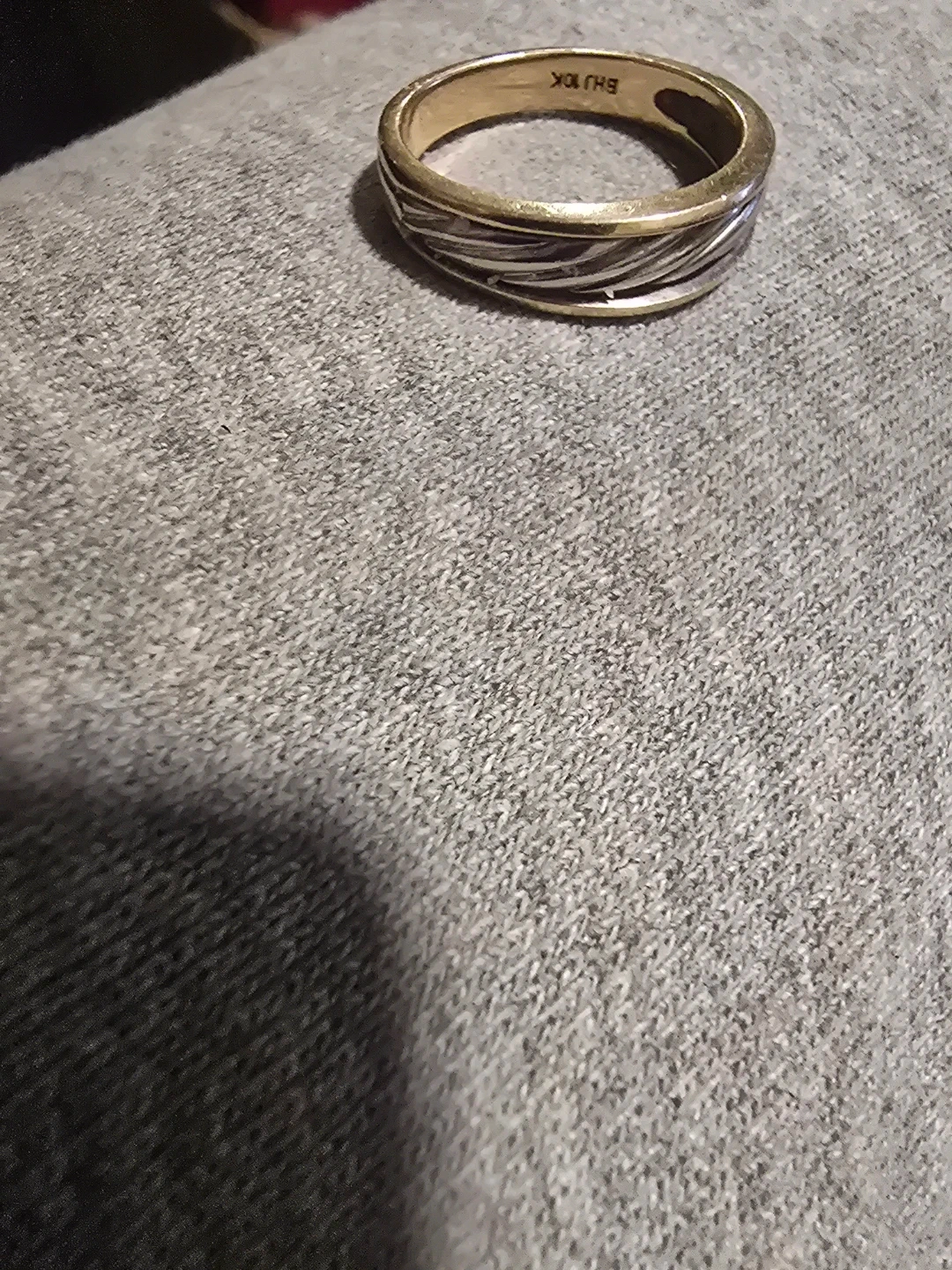 A stylish 10K gold ring featuring an intricate engraved design. This piece has a two-tone appearance, combining yellow and white gold elements.
