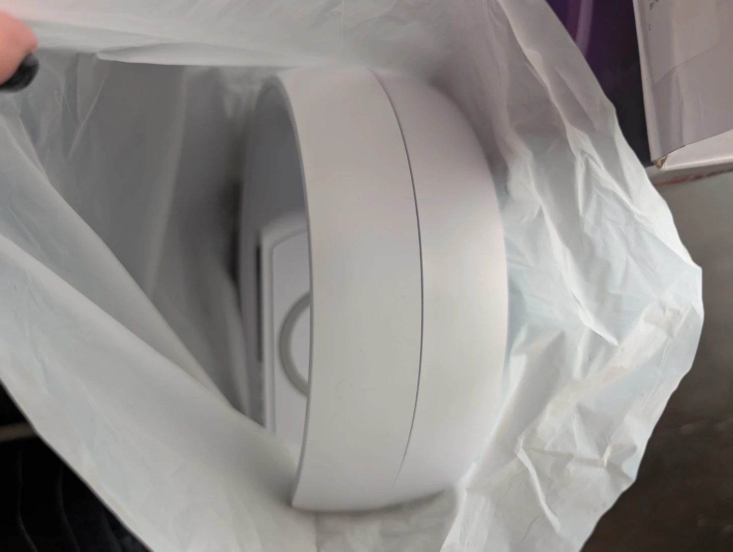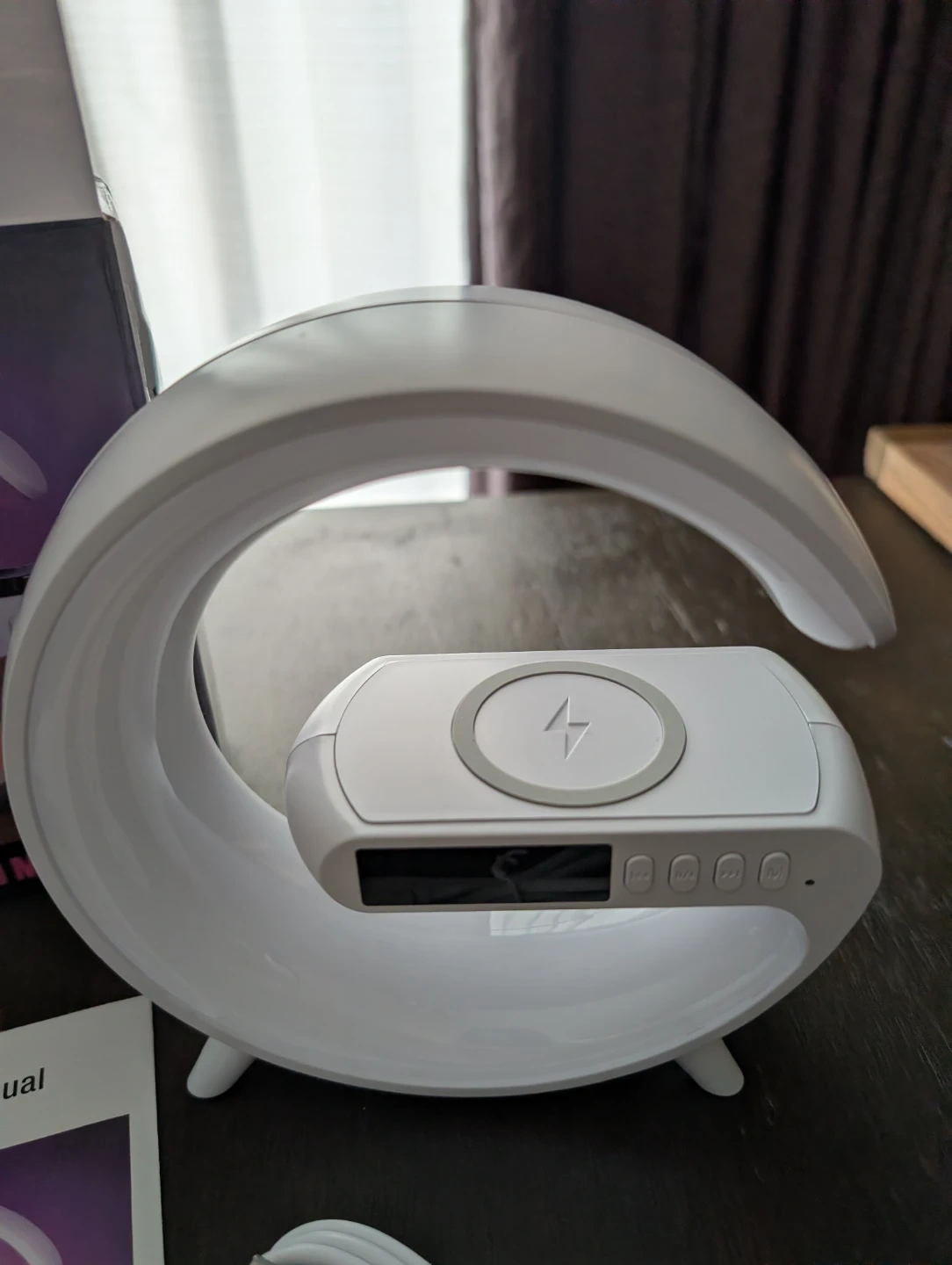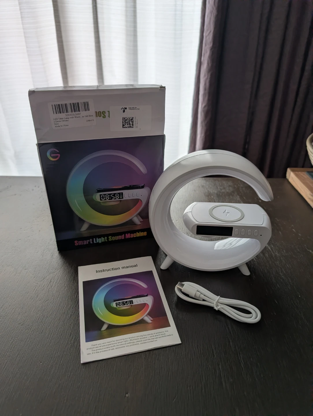 This smart light sound machine features a unique C-shaped design that mimics a sunrise and has a built-in wireless charger. It also includes an instruction manual and USB cable. It's great for creating a relaxing atmosphere or as a bedside alarm clock.