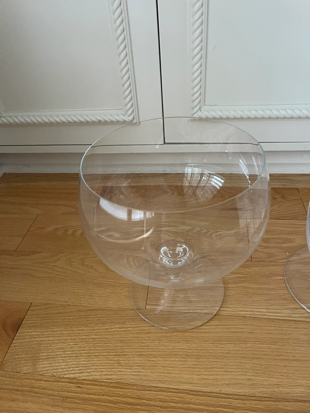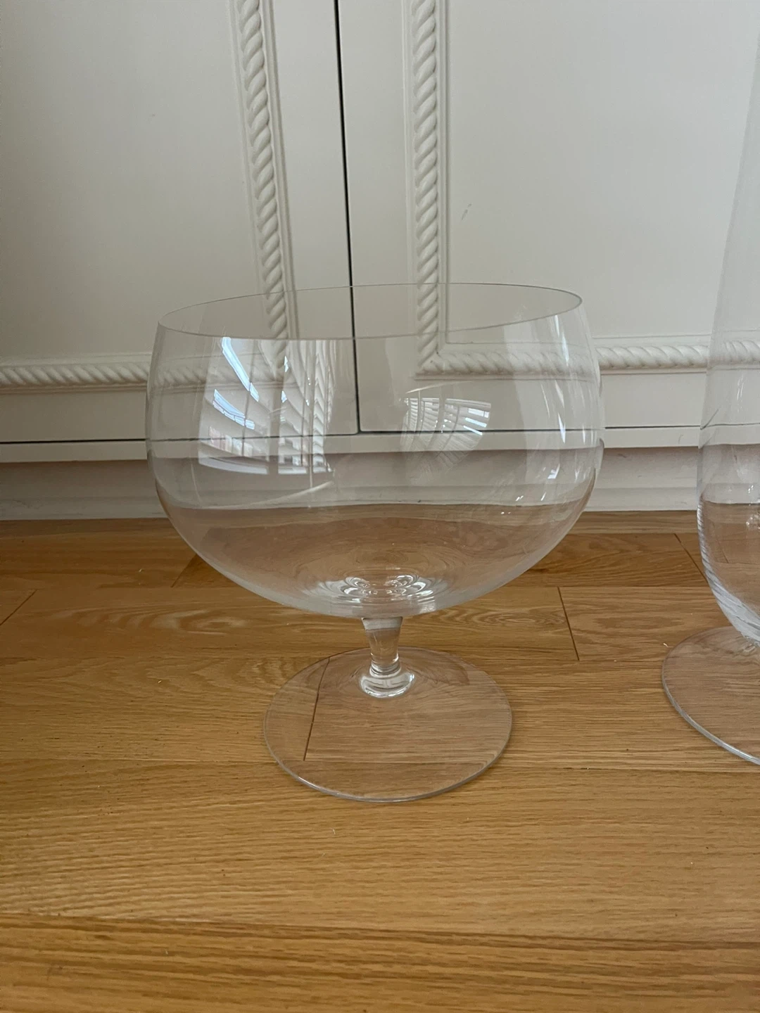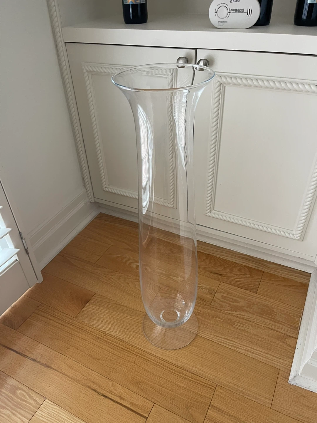 Two tall clear glass vases/vessels.One trumpet-shaped and one wide bowl-shaped vase. Perfect for displaying large floral arrangements, bathrooms, hallways, dinning rooms etc
