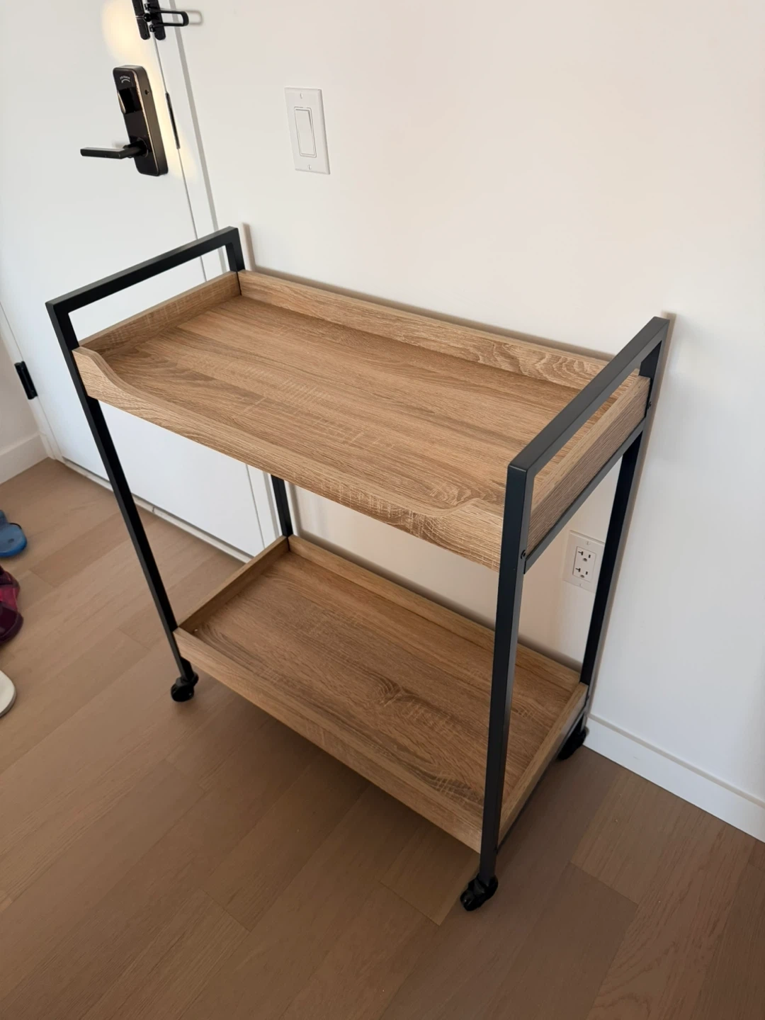 This bar cart has two wood-look shelves and a black metal frame. It's on wheels for easy movement. Great for serving drinks, as a coffee station, or extra storage!