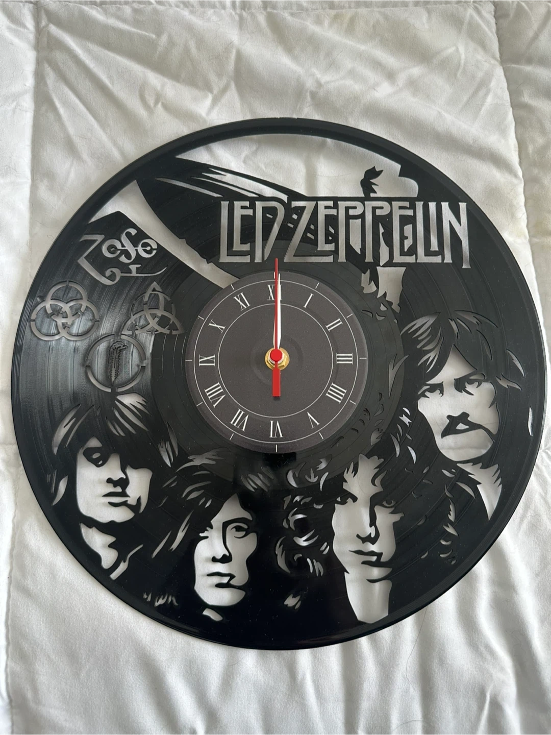 This unique wall clock is crafted from a vinyl record featuring Led Zeppelin imagery. It requires one AA battery to operate. Hang it up to showcase your love for classic rock!