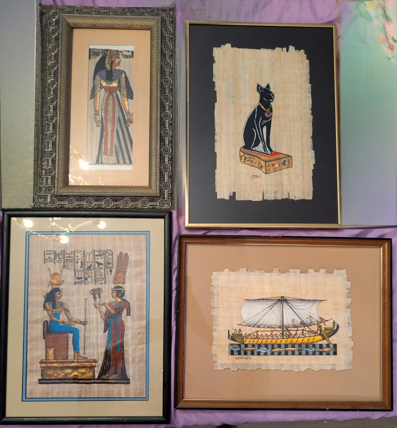 This lot includes four framed pieces of Egyptian papyrus art. Depicts a black cat, a pharaoh and attendant, a winged goddess, and a Nile river boat scene. The papyrus is handmade with unique textures. Comes ready to hang.