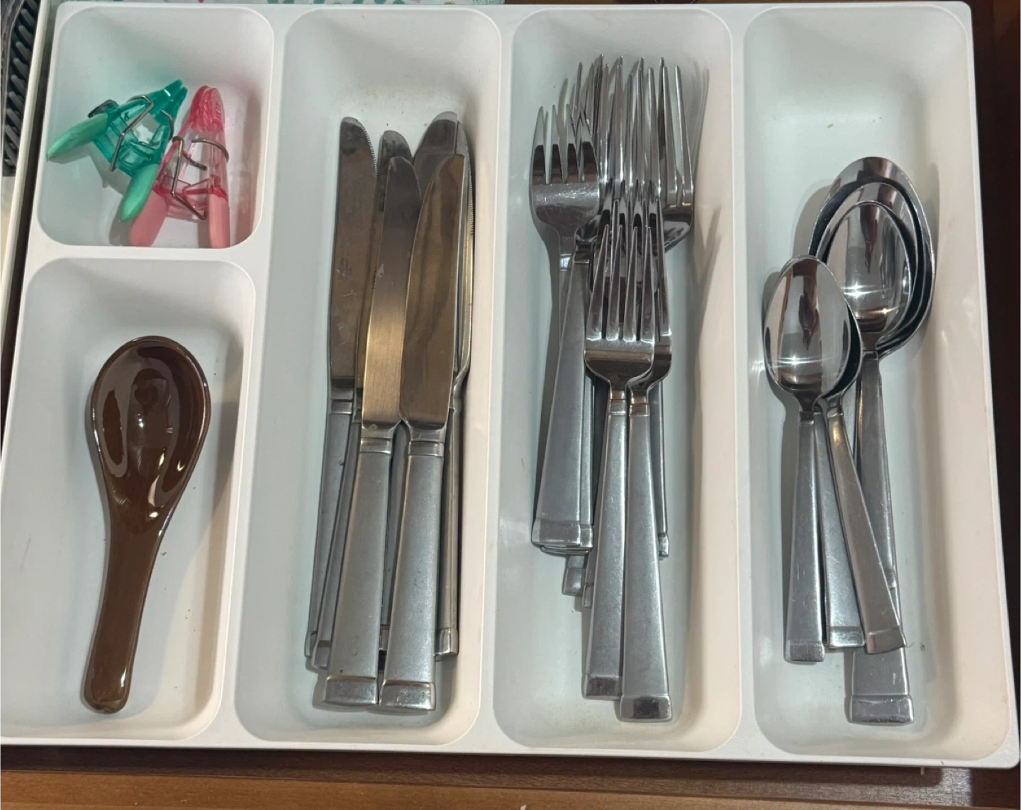 White plastic cutlery organizer tray. It holds knives, forks, spoons, and chopsticks. Utensils made of stainless steel and wood. A brown ceramic spoon is also included.