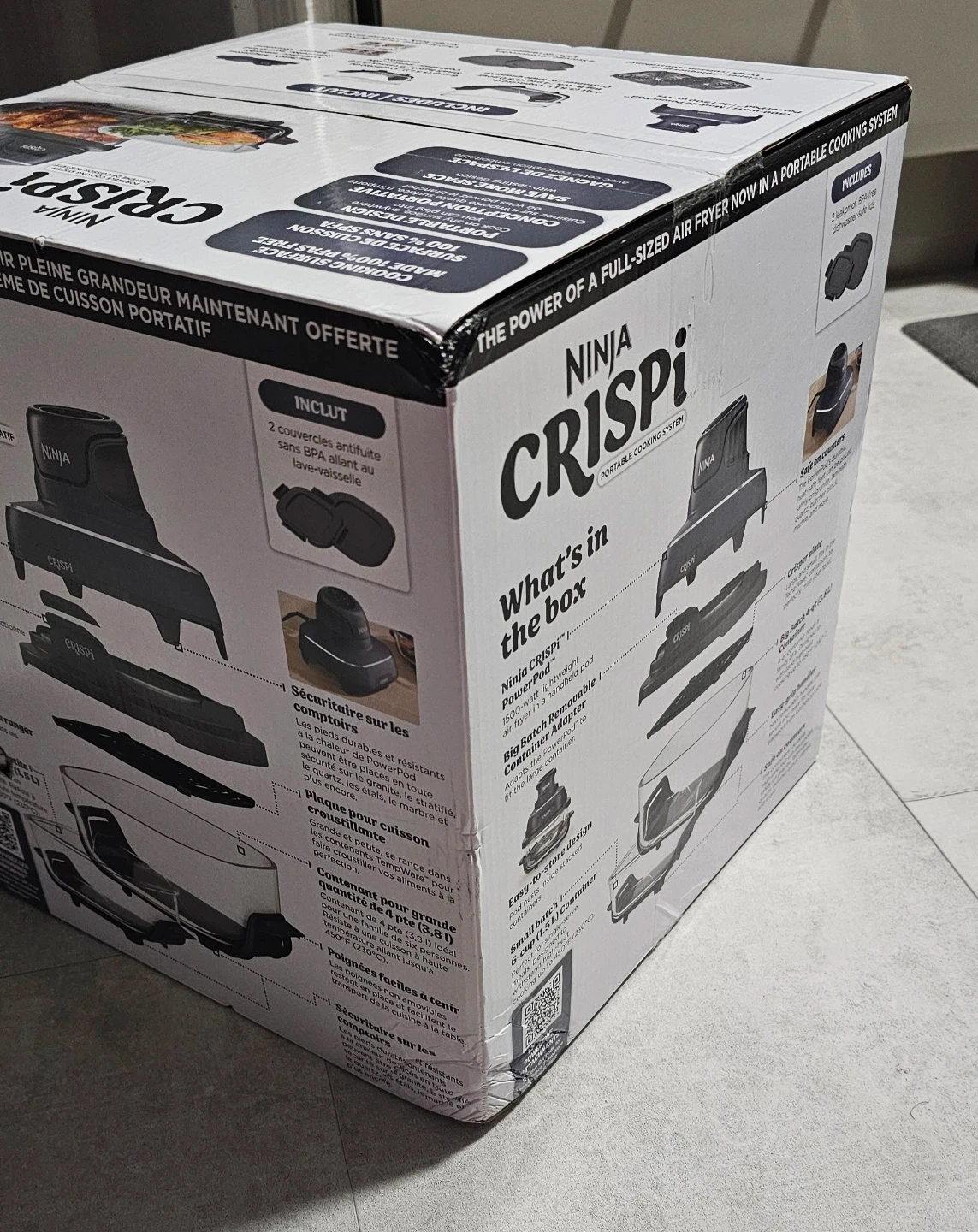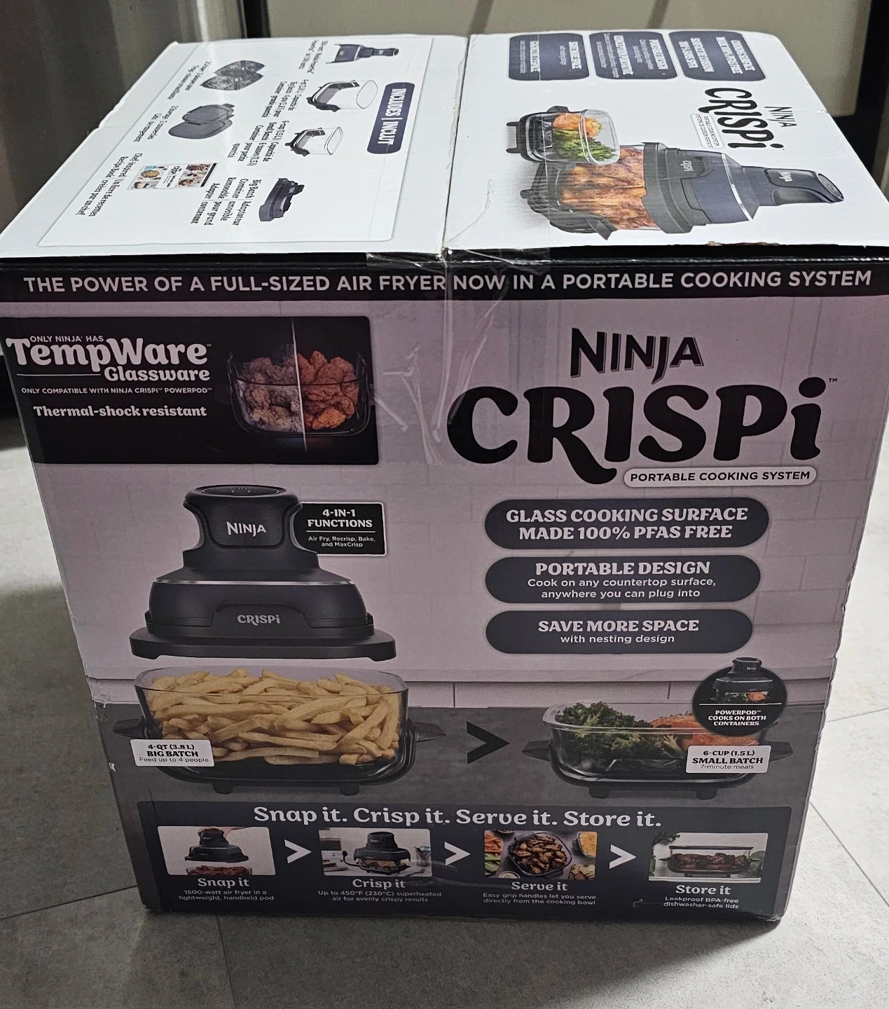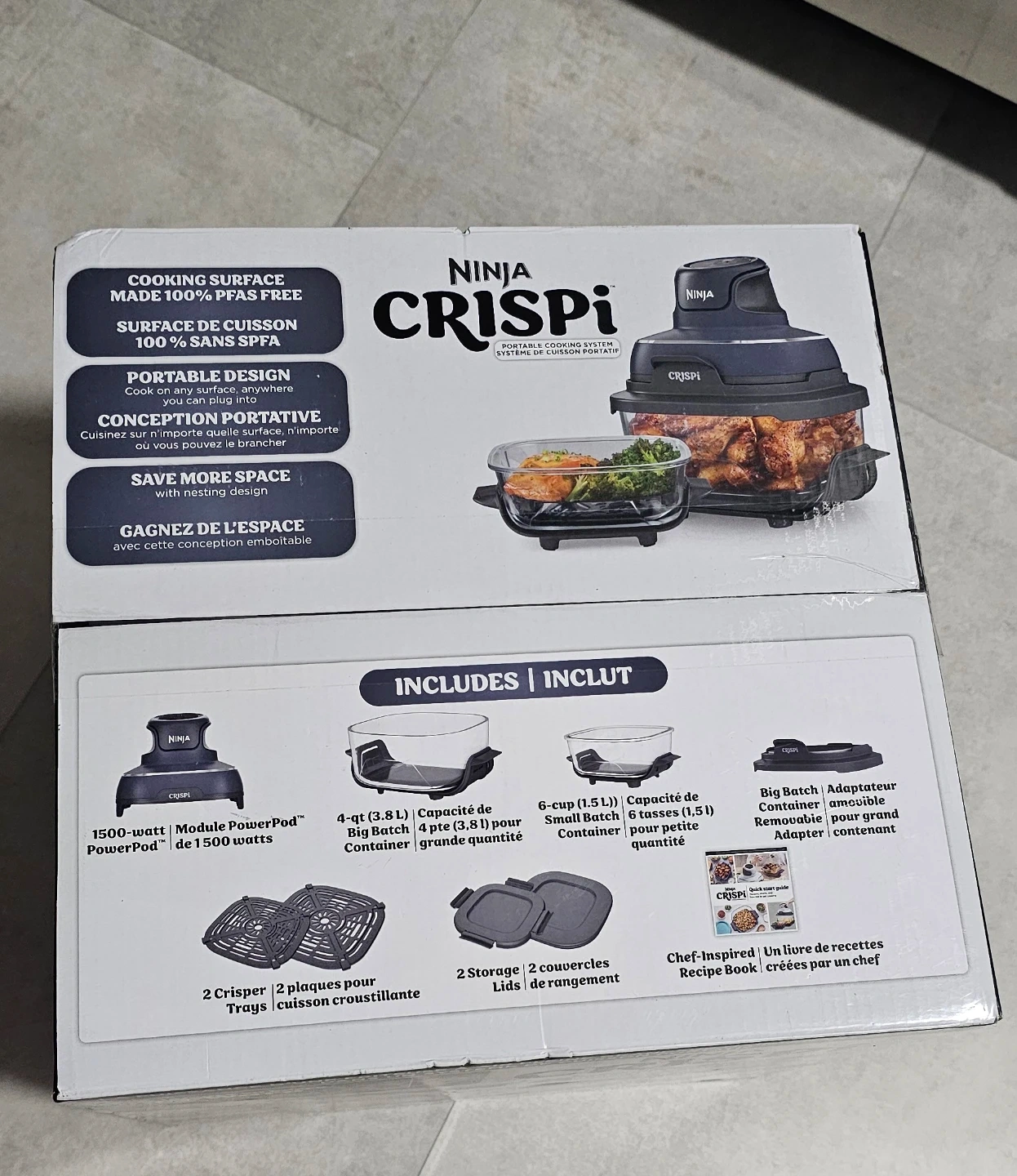 Ninja Crispi Portable Cooking System. It features a glass cooking surface. The portable design allows for countertop use anywhere you can plug it in. Comes with a 4-qt (3.8L) crisper basket and 6-cup (1.5L) small batch crisper pan.