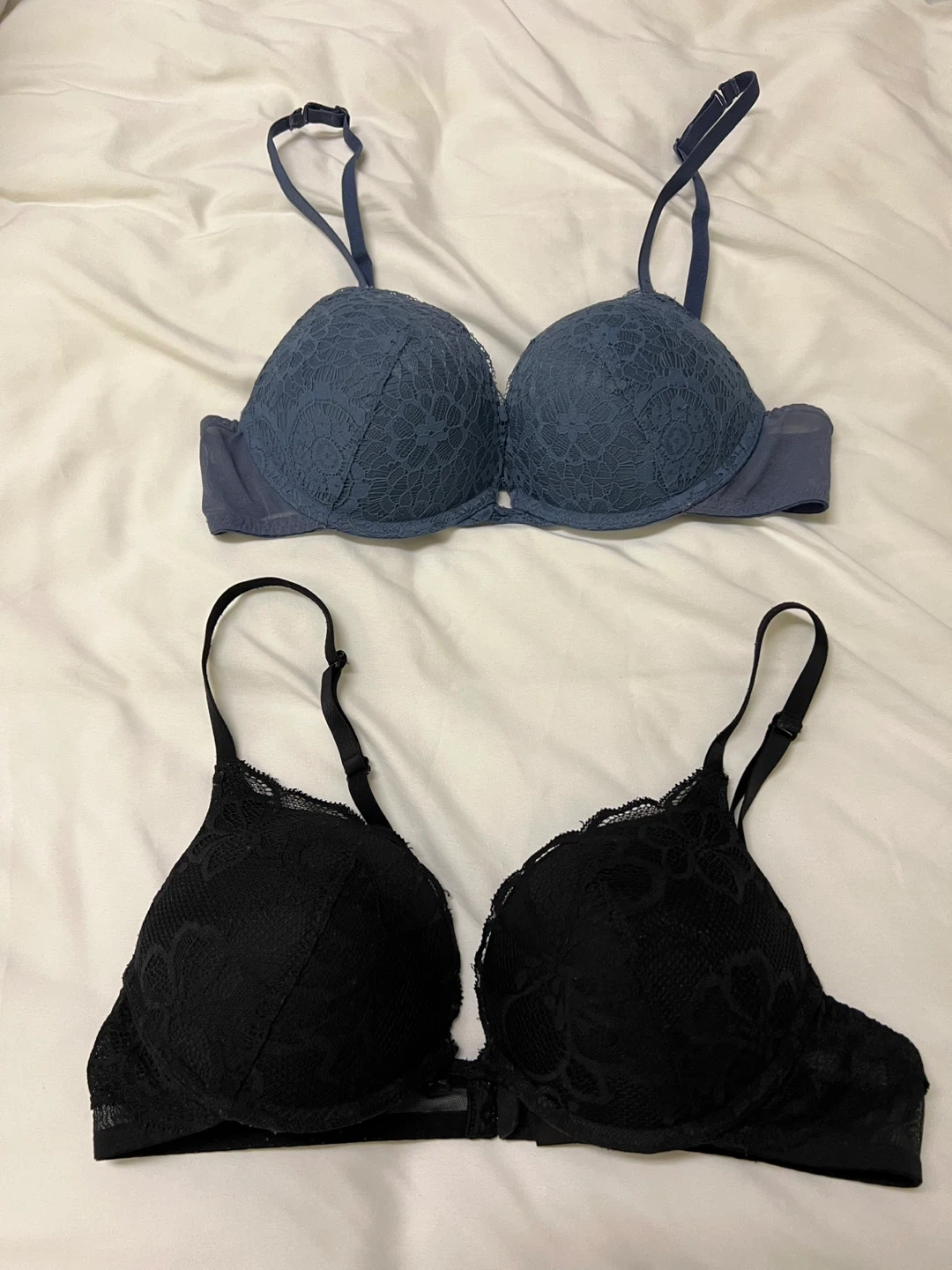 $25 for the blue lace bra; $20 for the black lace bra. Pick up in person and cash only.