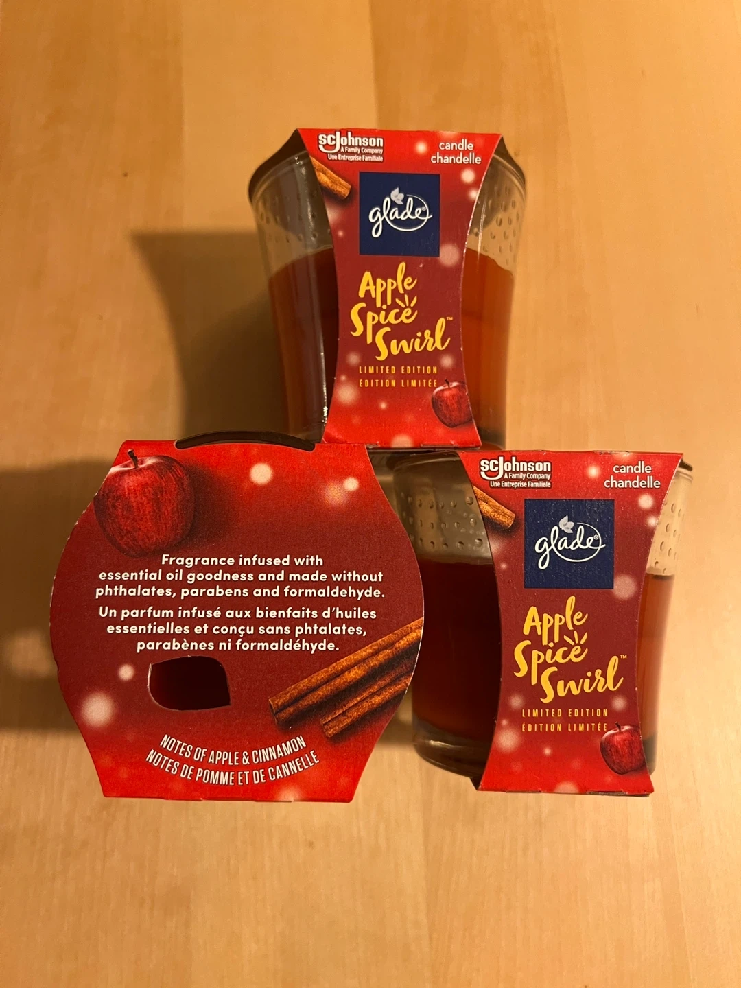 Selling three Glade Apple Spice Swirl candles - brand new and never lit!