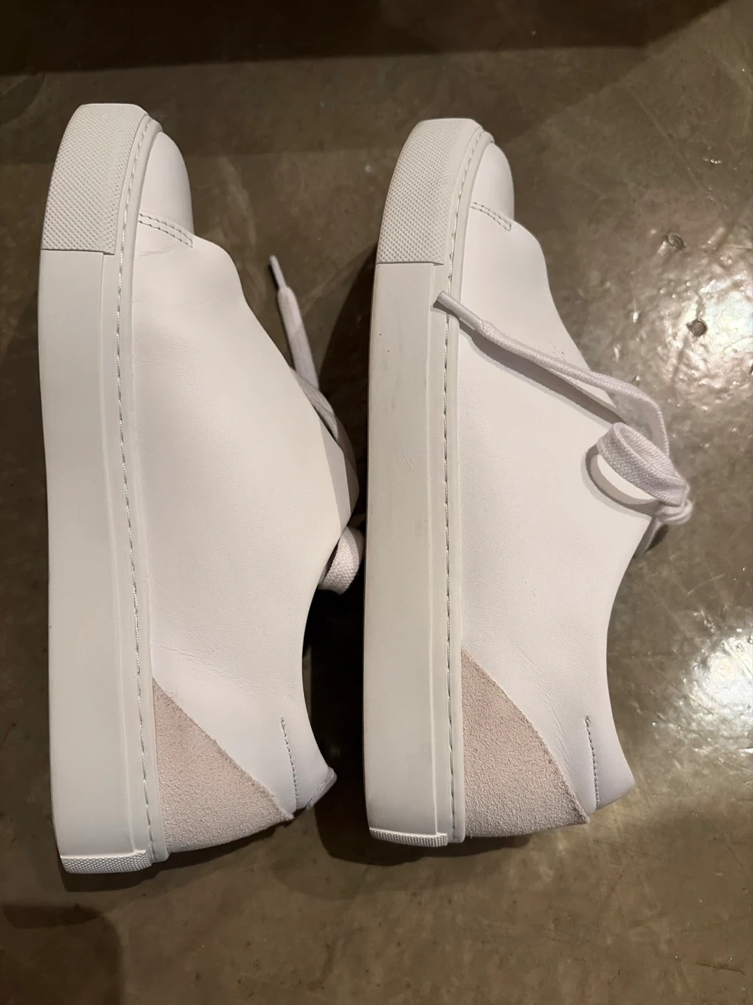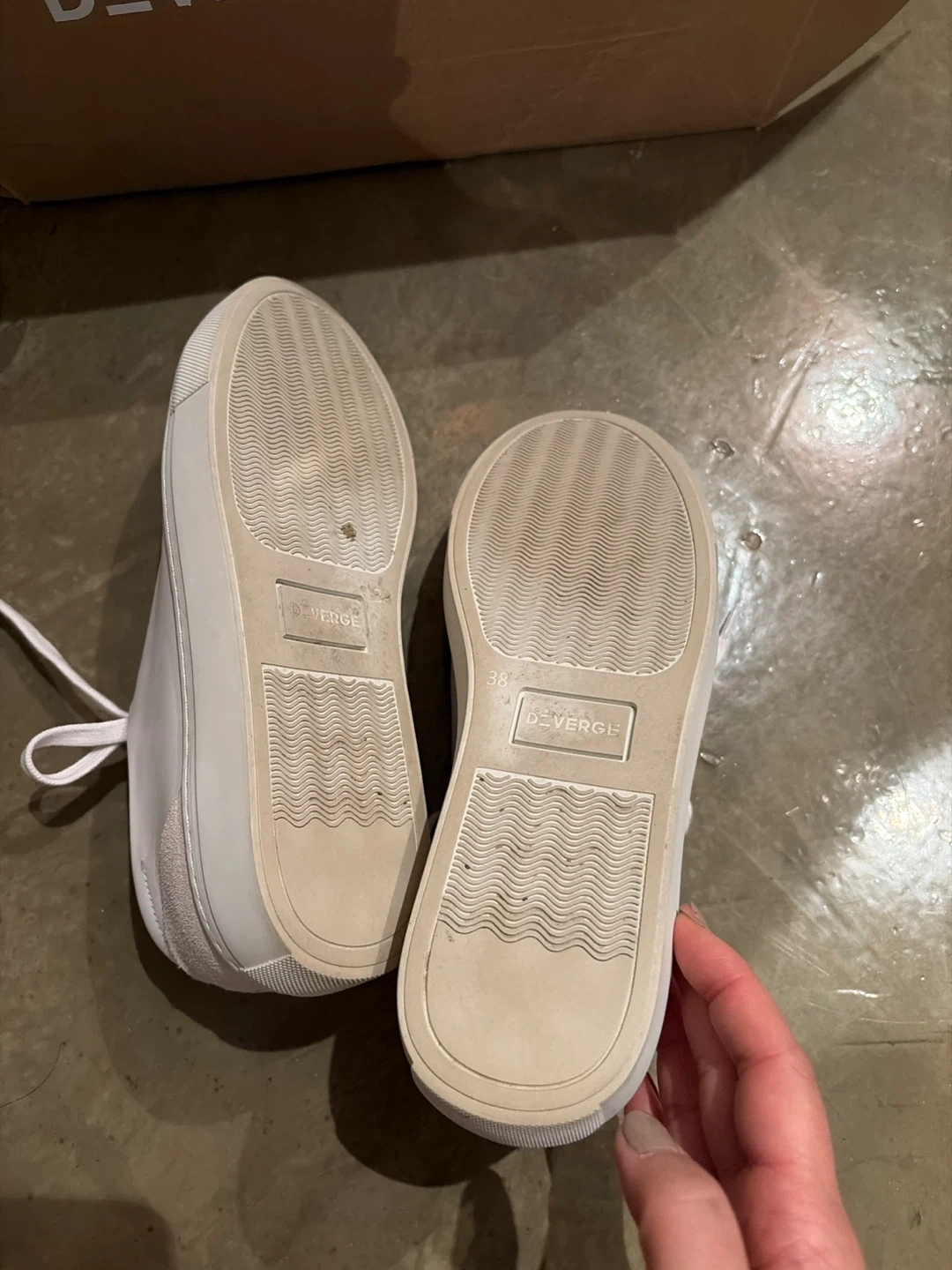 These are white leather Diverge sneakers (made from Portugal) with a suede accent. They're a size 38. Comes with original box. Worn twice but they are a bit narrow (I have bunions) so they pinch my little toes. They retail over $250 usd. Just want the to find a new home. In excellent condition. Check photos. No marks or dirt other than the bottoms of the shoes that worn twice.