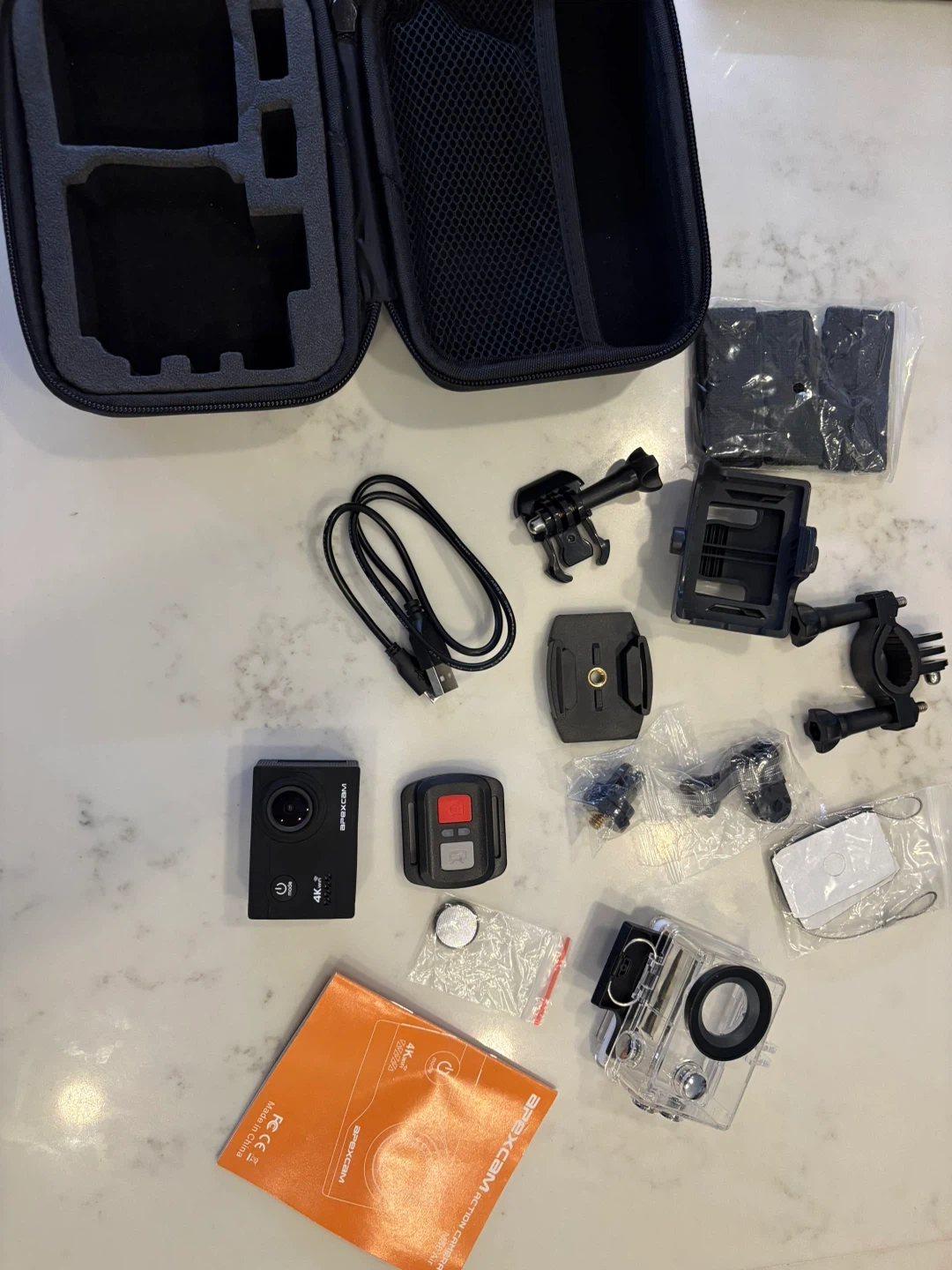 This ApexCam action camera records in 4K with WiFi capability. It comes with a waterproof housing and various mounting accessories. Includes battery charger and 2 batteries included. Great for capturing outdoor adventures!