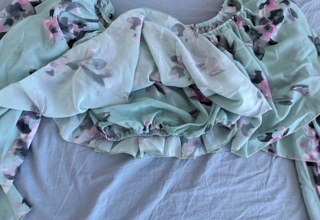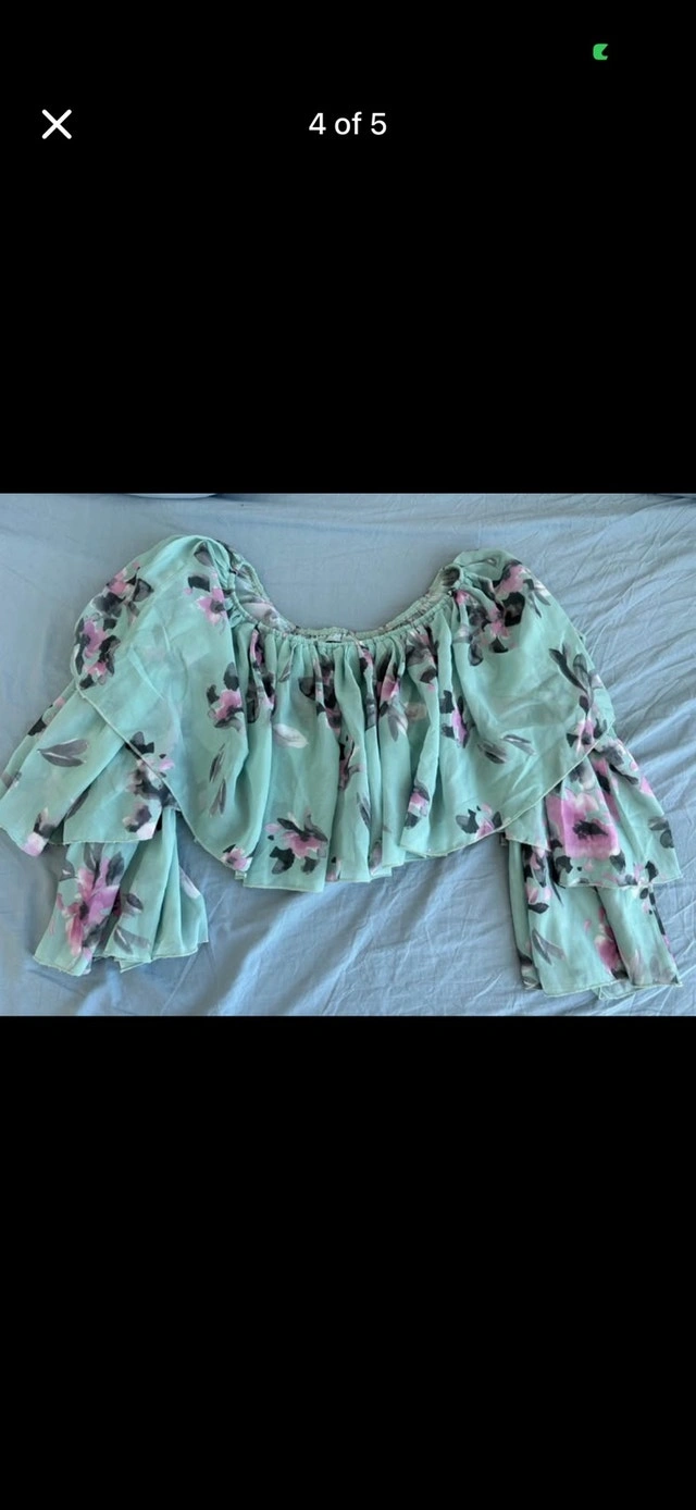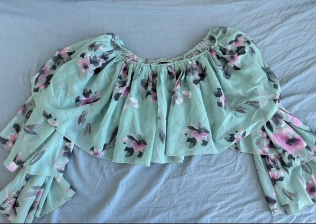 Add a touch of floral fancy to your wardrobe with this adorable, used off-the-shoulder blouse featuring a delicate floral pattern and ruffled sleeves. This top is a size small. Style: Off-the-Shoulder, Pattern: Floral, Sleeves: Ruffled. This blouse is perfect for adding a bit of charm to any outfit. If the ad is up, it's still available! Cash accepted.