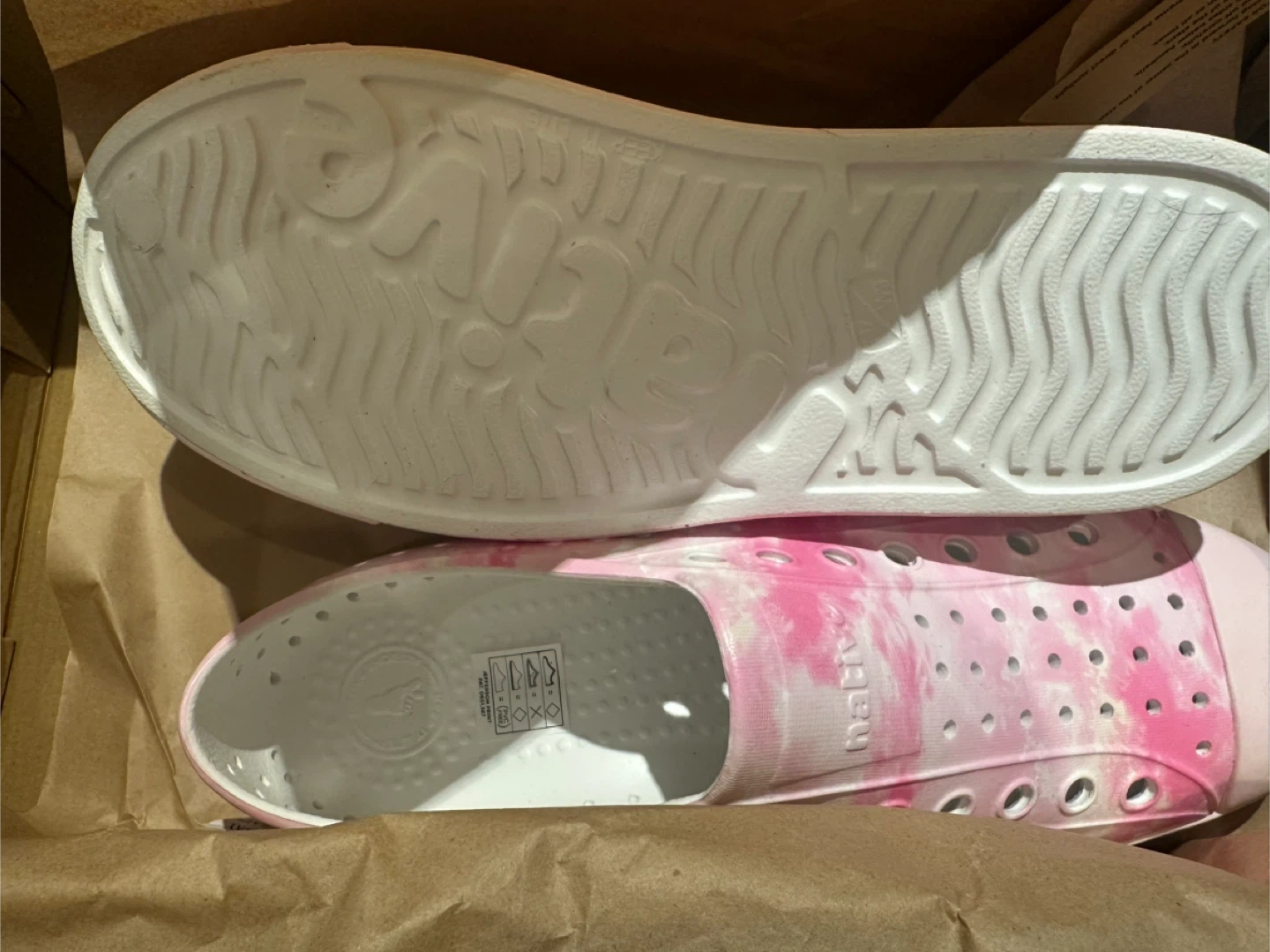 Native Jefferson Sugarlite Print shoes in a pink clouds tie-dye pattern. These are a size UK 6, EUR 40, JP/CM 25.25. They're made from a lightweight, waterproof material perfect for summer.