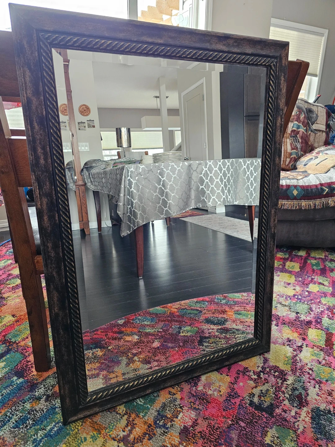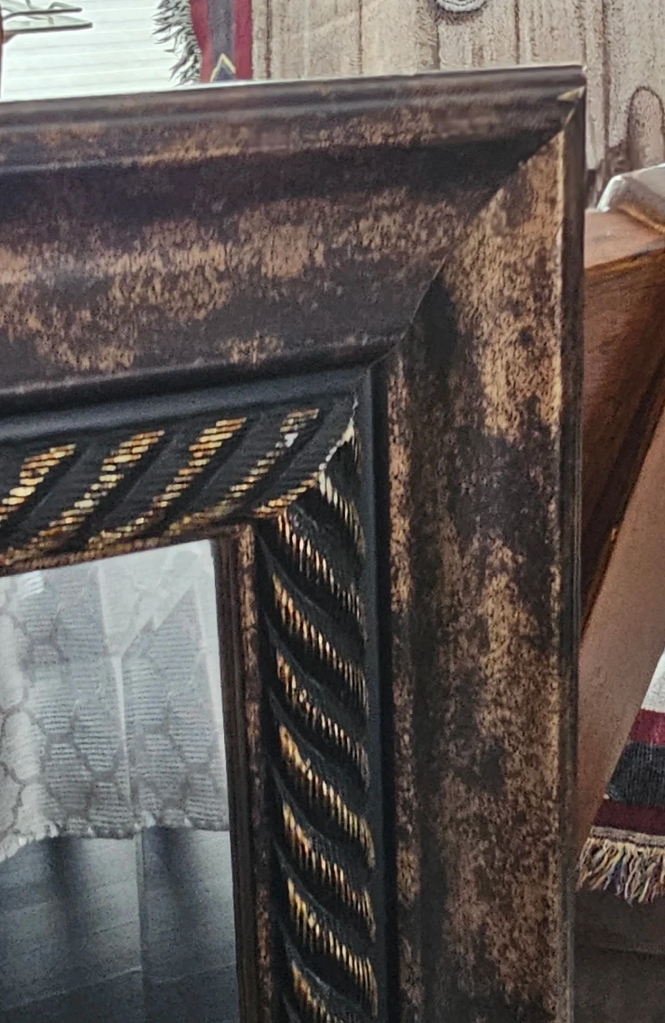 Decorative mirror with a bronze rope frame. Includes hanging instructions and hardware. This mirror's distressed bronze finish adds a touch of rustic charm to any room.