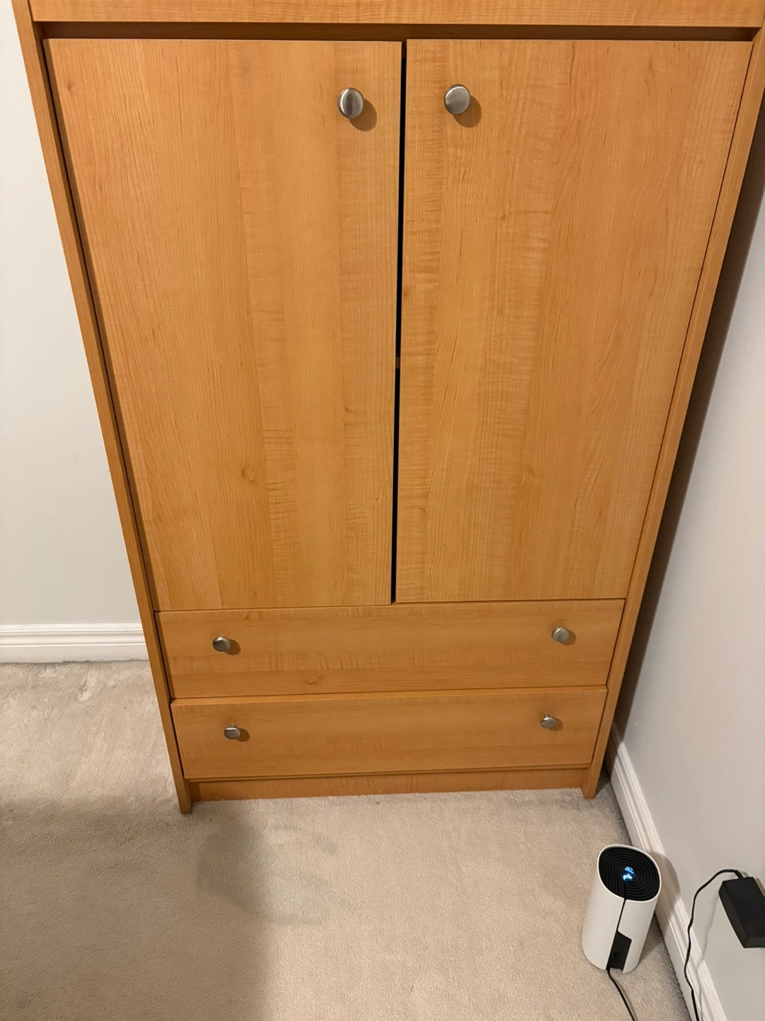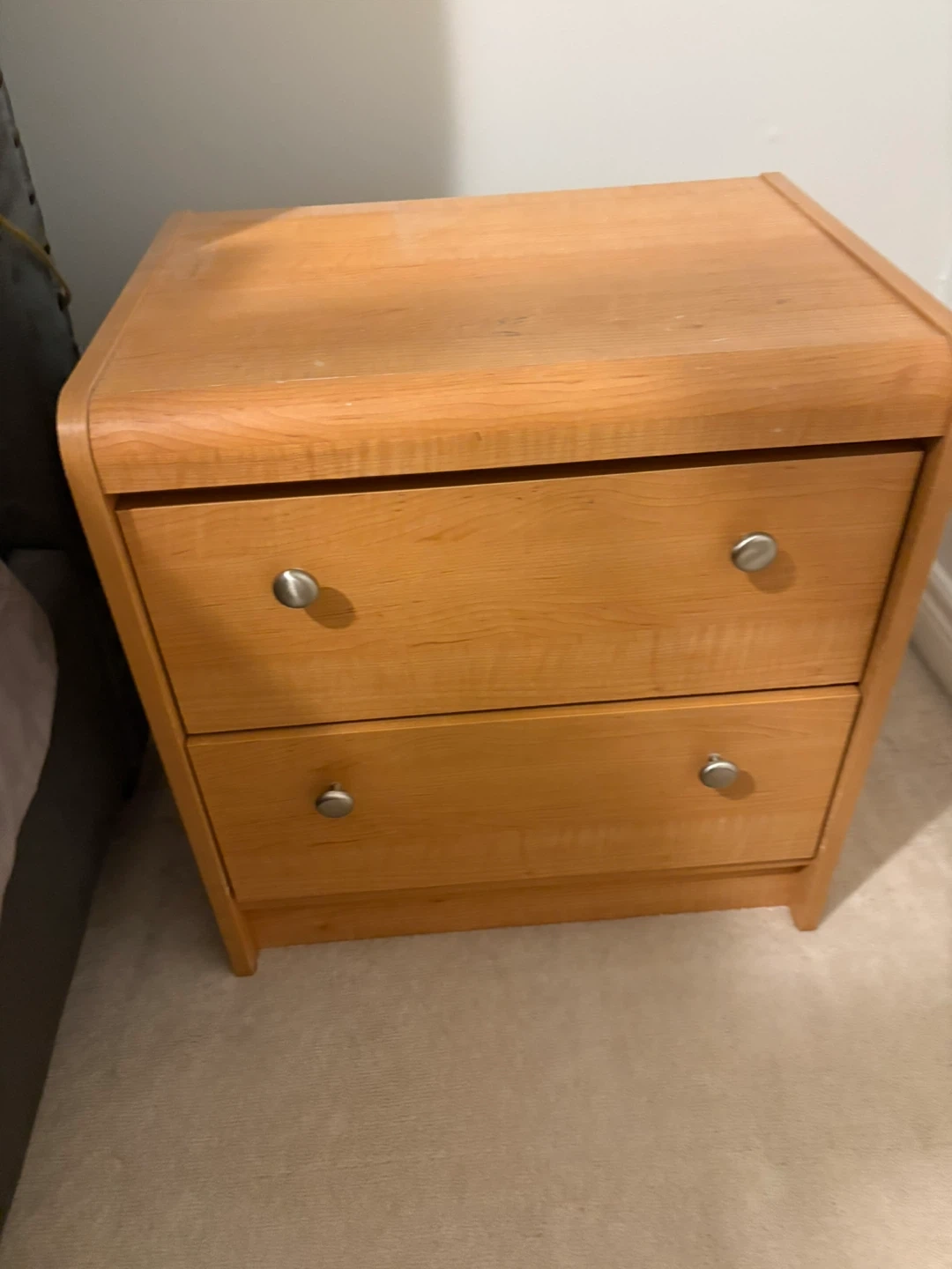 A two-drawer nightstand made of light-coloured wood. It has silver-coloured knobs for easy opening. This piece is great for keeping your bedroom tidy and essentials close at hand.