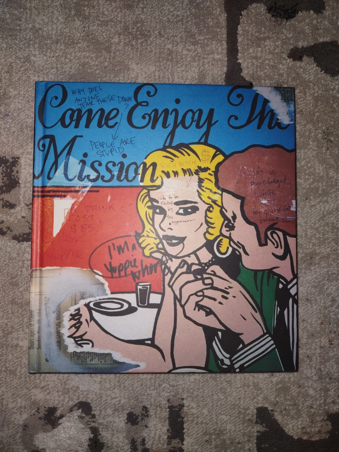 This is the 'Come Enjoy The Mission' book. It features a pop art style cover with various handwritten notes and doodles. The artwork is vibrant and eye-catching.