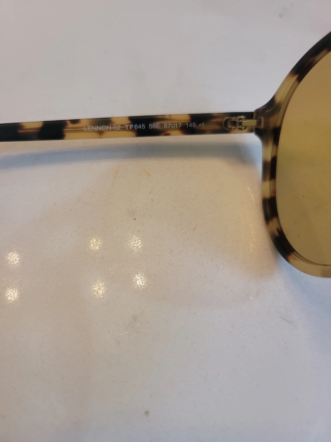 These are Tom Ford LENNON-02 sunglasses. They feature a tortoise shell frame and amber lenses. The frame measures 56mm lens width and 17mm bridge width.