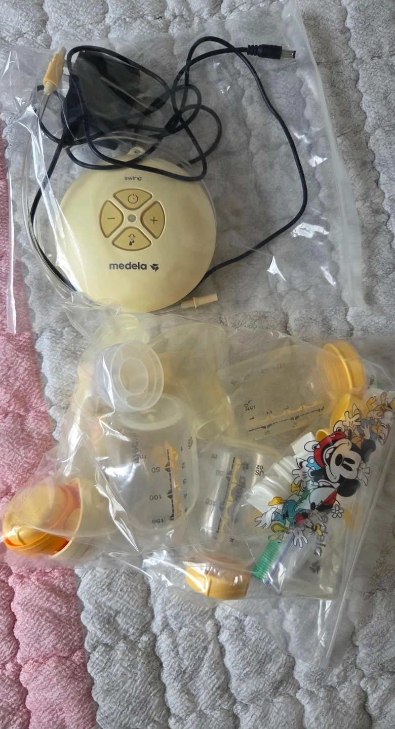 Selling a Medela Swing breast pump. It comes with all the accessories pictured, including bottles and the power adapter. Great for new parents!
