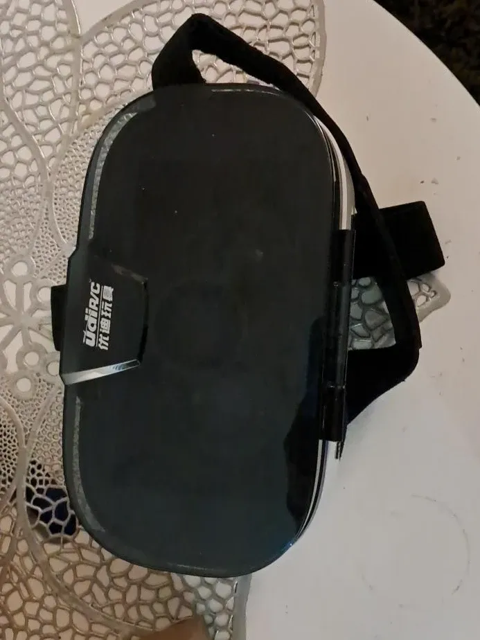 This is a UdirC VR-1 virtual reality headset in black and white. It's made of ABS plastic and has adjustable straps. The recommended age is 10 years and up. It's never used I am moving to my country delivery also available free of coast depend upon distance between 5km