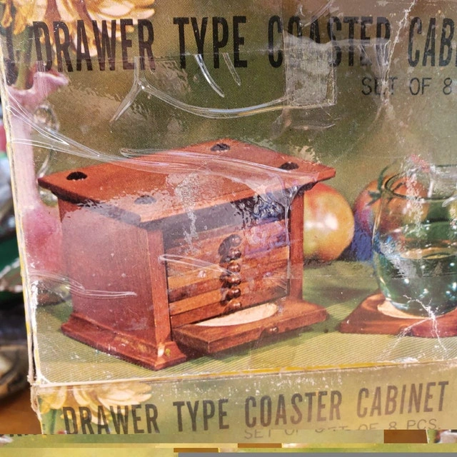 3 new Vintage Wood And Cork Coaster Set In Cabinet. Each coaster is a wood base with a cork inset measuring 3.75” x 3.5”. The rack/holder is all wood and measures 5.25” wide x 3.75” deep x 3.75” tall. Asking $15 each or all 3 sets for $25. PICK UP ON OLD RICHMOND ROAD NEPEAN