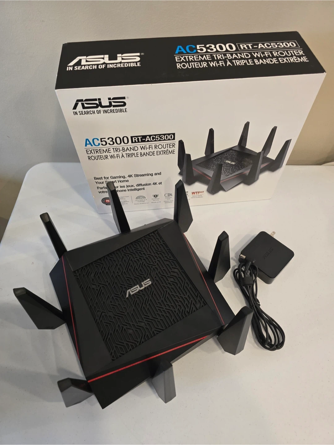 This ASUS RT-AC5300 router is tri-band for extreme Wi-Fi performance. It's designed for gaming, 4K streaming, and demanding home networks. It comes with an original box and all accessories.