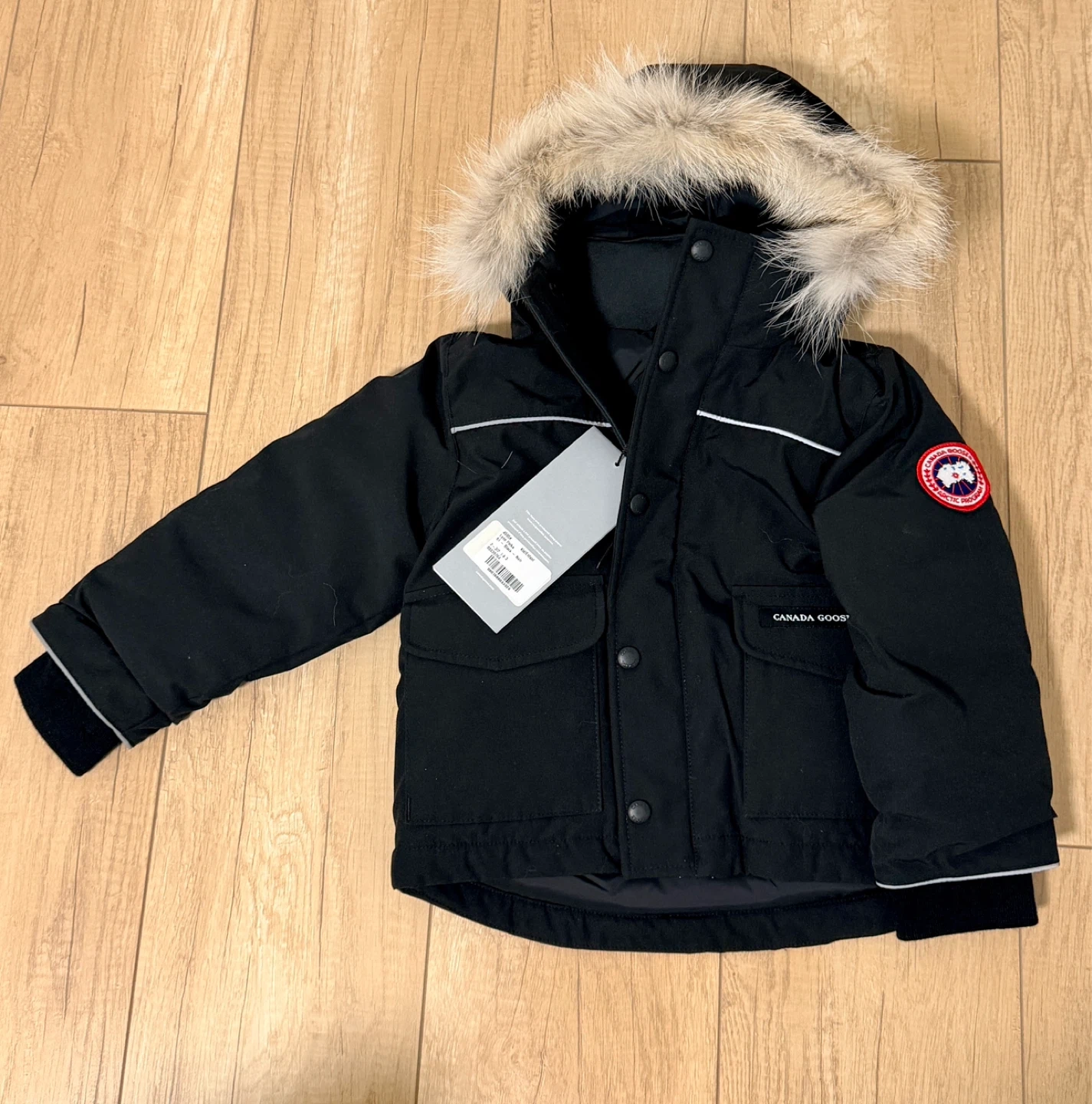 This is a black Canada Goose puffer jacket for youth in size medium. It features a fur-lined hood and the classic Canada Goose patch. It's made for warmth and durability.