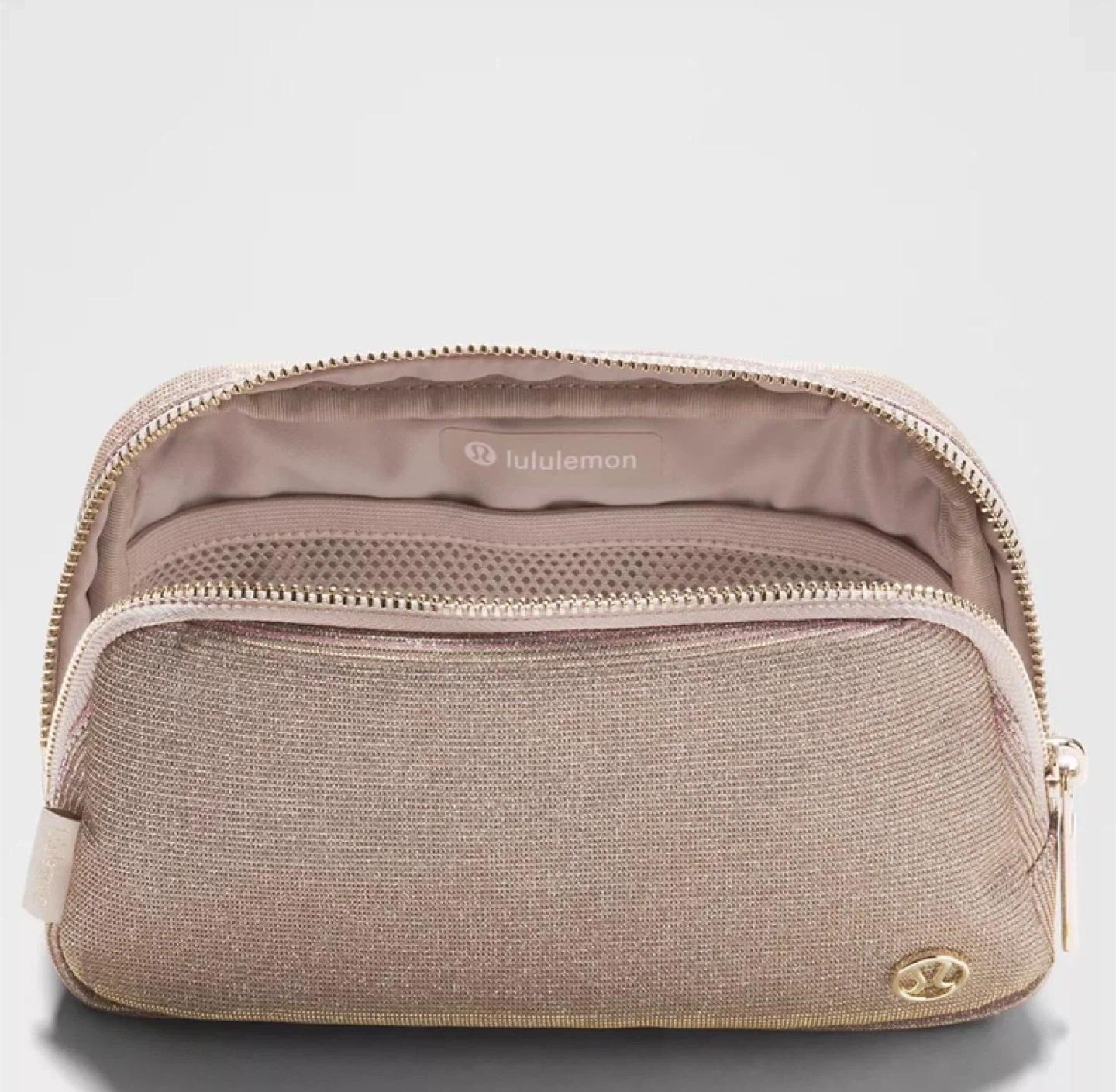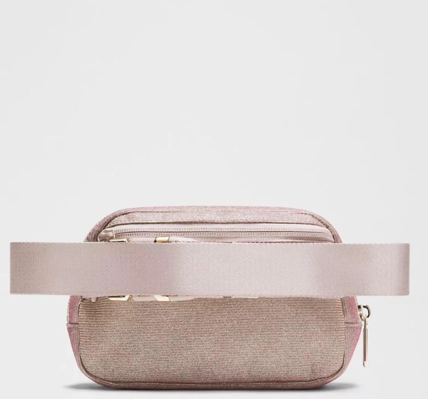 This Lululemon Everywhere Belt Bag is in a lovely rose gold glitter colour. It's a versatile accessory for carrying your essentials. It features multiple pockets and an adjustable strap. This bag is great for on-the-go activities!