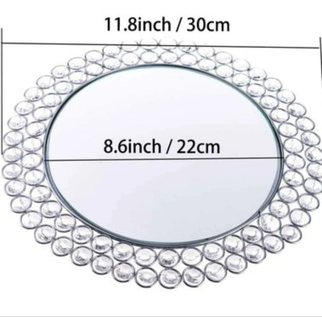 This decorative tray features a mirrored surface surrounded by sparkling crystal beads. It measures 11.8 inches by 8.6 inches. It's perfect for displaying perfumes, makeup, or small decorative items on a vanity or dresser.