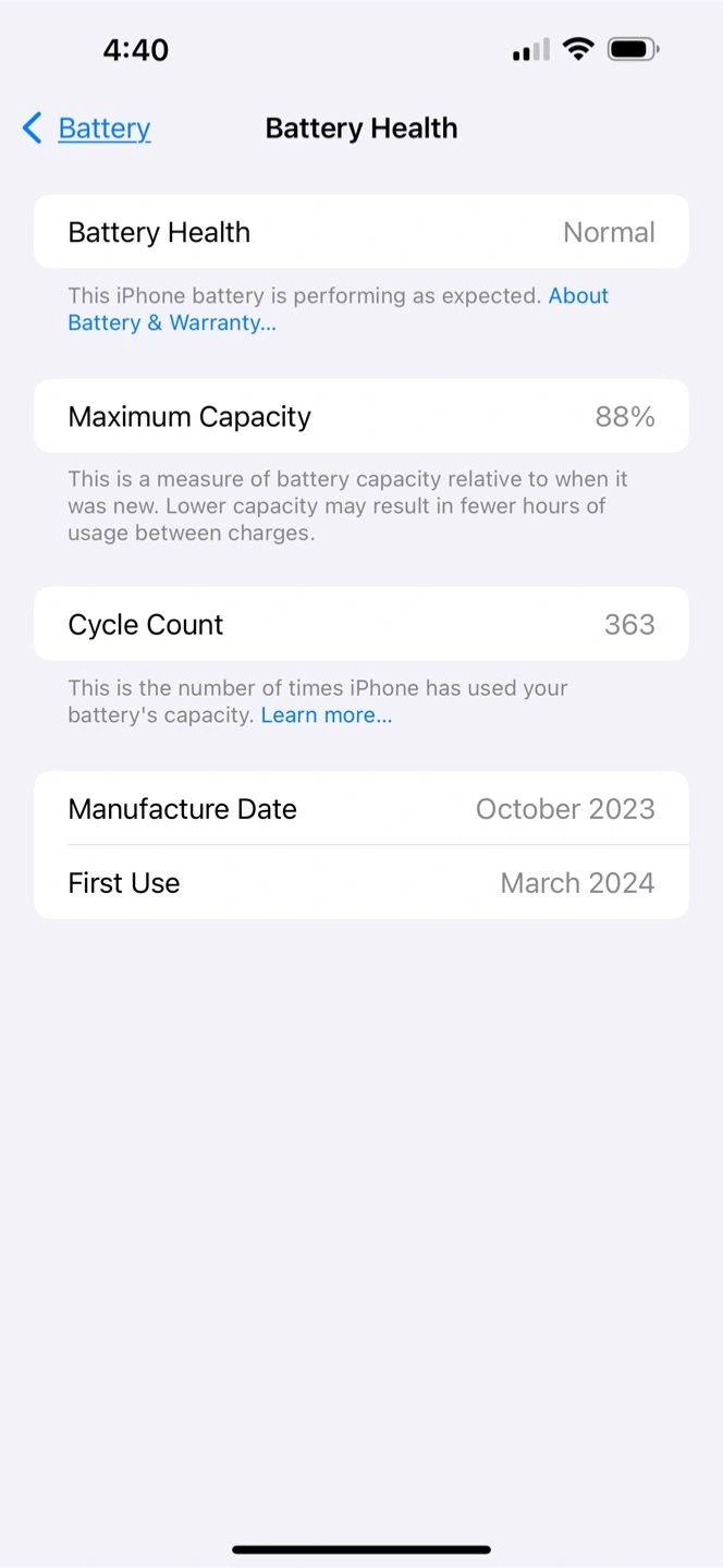 Selling an iPhone 15 Pro Max. The battery health is at 88% . It was manufactured in October 2023 and first used in March 2024.