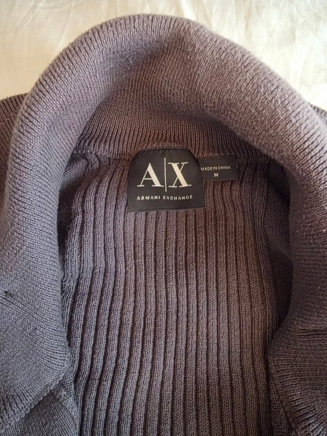 Cool grey ARMANI EXCHANGE cardigan sweater for men. It's a size medium with a button-up front and a classic collar. This knit sweater's ribbed details add a touch of style. Great for layering!