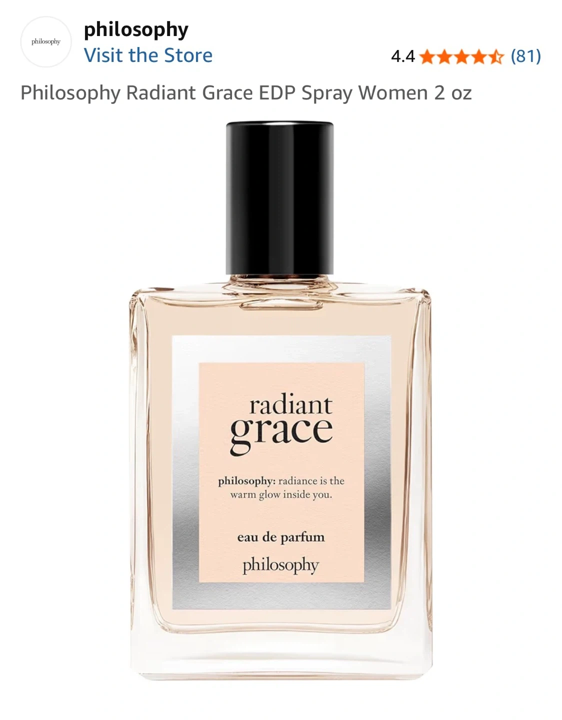 Philosophy Radiant Grace Eau de Parfum. It's a 2 oz / 60 ml spray bottle. Radiance is the warm glow inside you. Retails for $92