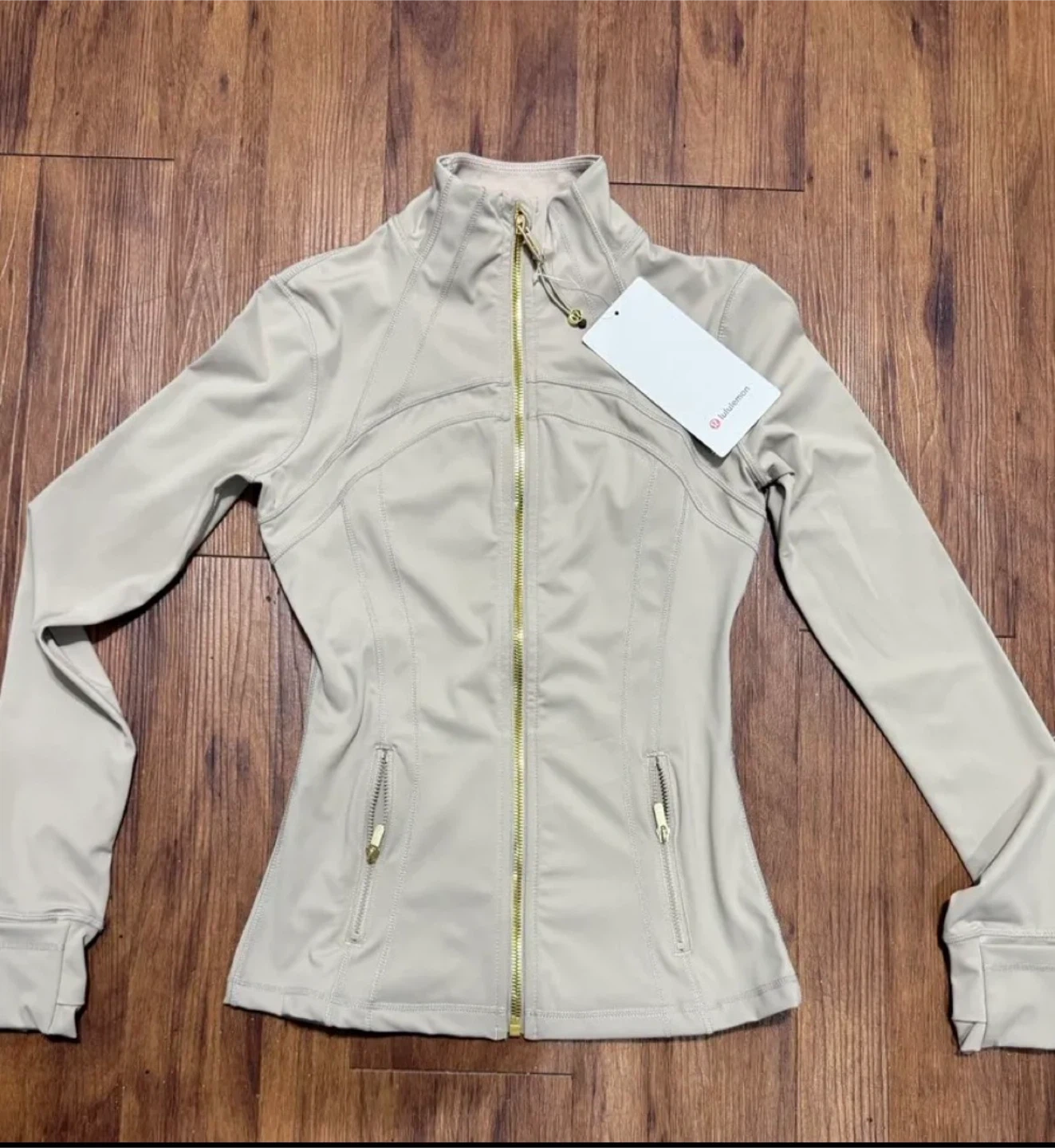 This Lululemon jacket is a stylish beige colour. It features a full-zip front and zippered pockets. Perfect for active days or casual wear!
