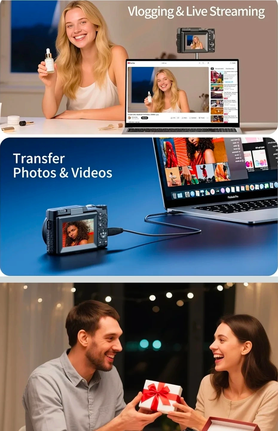 This digital camera shoots 5K cinema video and 64MP pro photos. It features AI autofocus and an 18X pro zoom for getting closer. Includes camera, 64GB card, battery, charging cable, and manual.