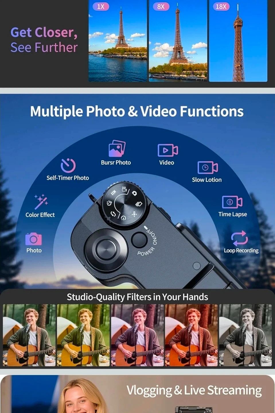 5K Ultra HD Digital Zoom Camera with 64MP Photos