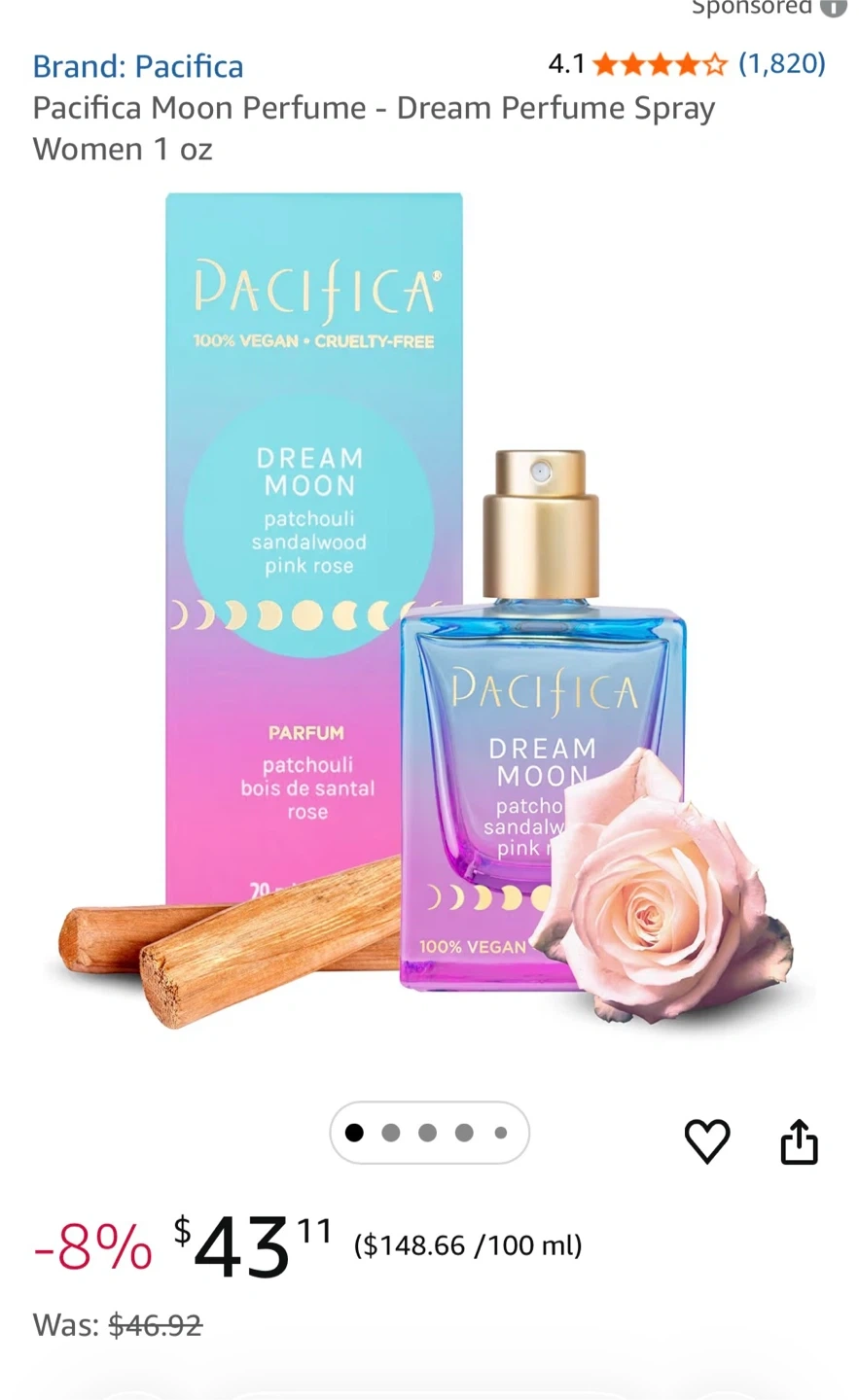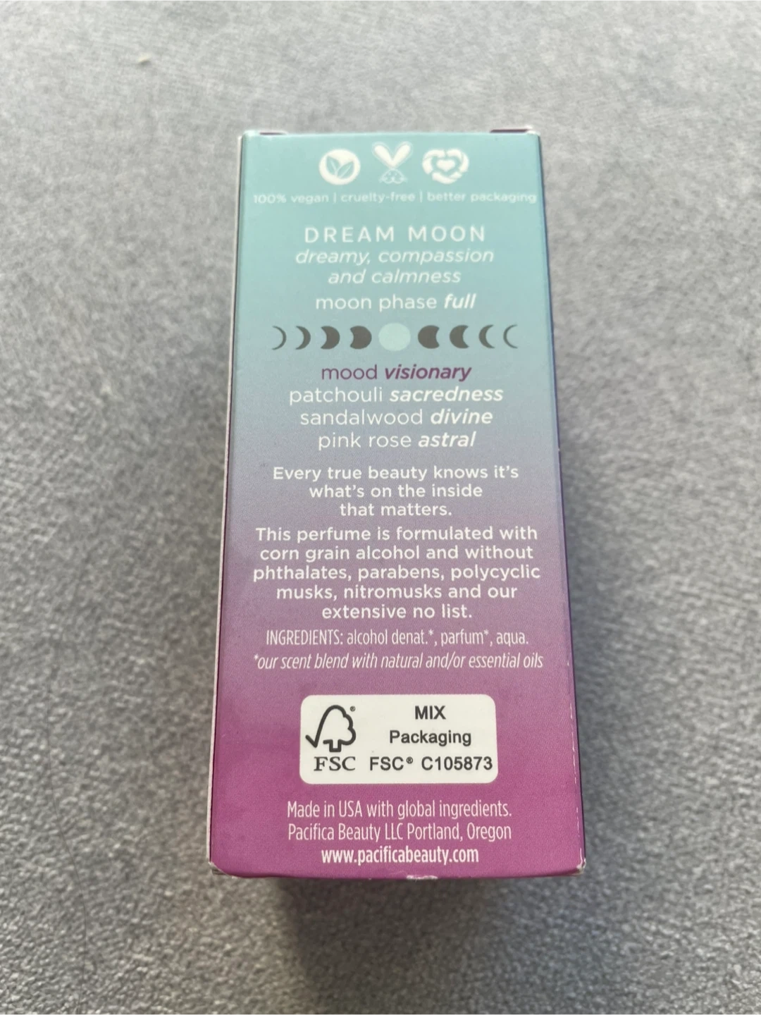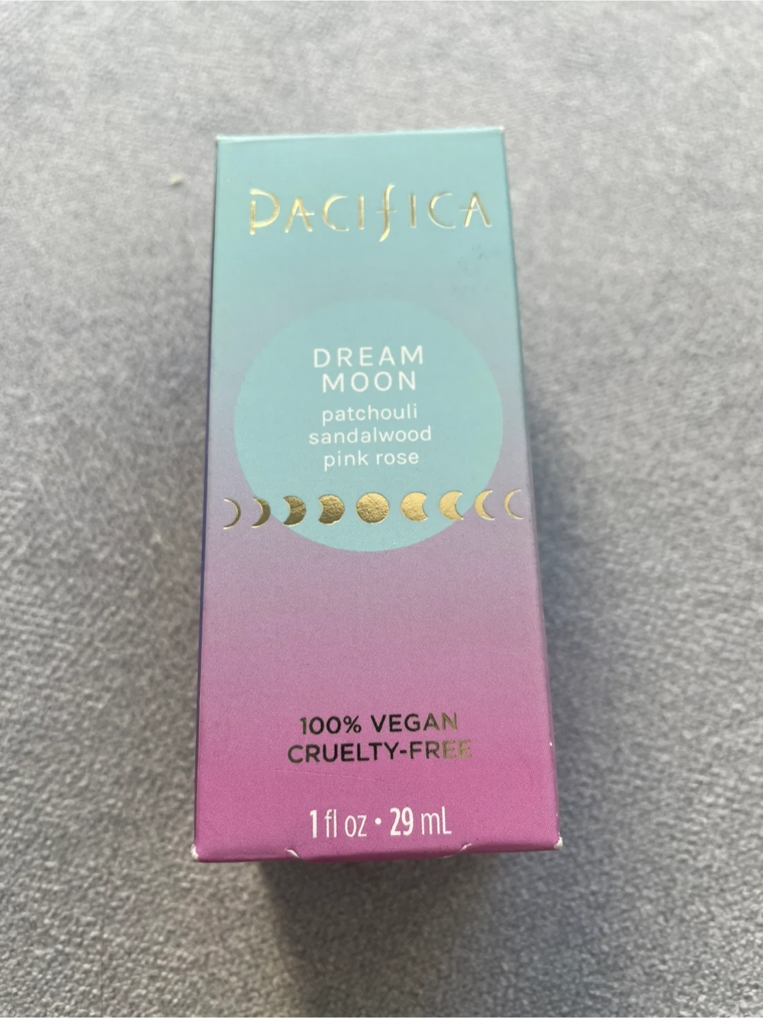 Pacifica Dream Moon perfume in a 1 oz (29 mL) bottle. It's vegan and cruelty-free.