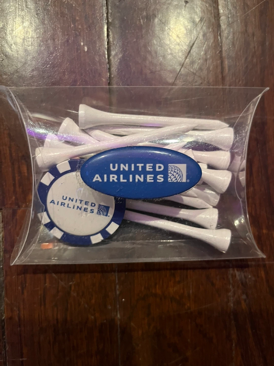 Selling a set of United Airlines golf tees and a ball marker. They come in a clear plastic box, perfect for any golf enthusiast or United Airlines fan!