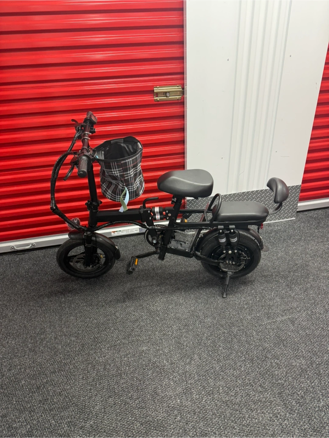 Black folding electric bicycle. It features a front basket and a dual seat. Disc brakes are on the front wheel.
