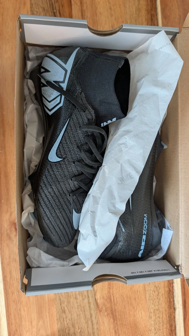 Brand new Nike Mercurial Superfly 10 Elite Firm-Ground High-Top Football Boots. Unisex colorway in Black/Ice Blue. Size US Men's 5.5 / Women's 7. These were purchased in the wrong size; retail was over $400 with tax. Asking $175. Pick up in Aurora only. Cash accepted.