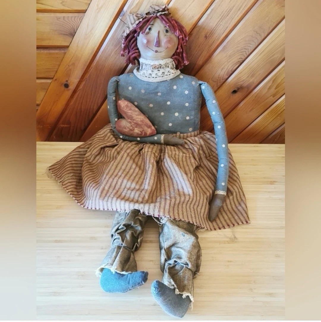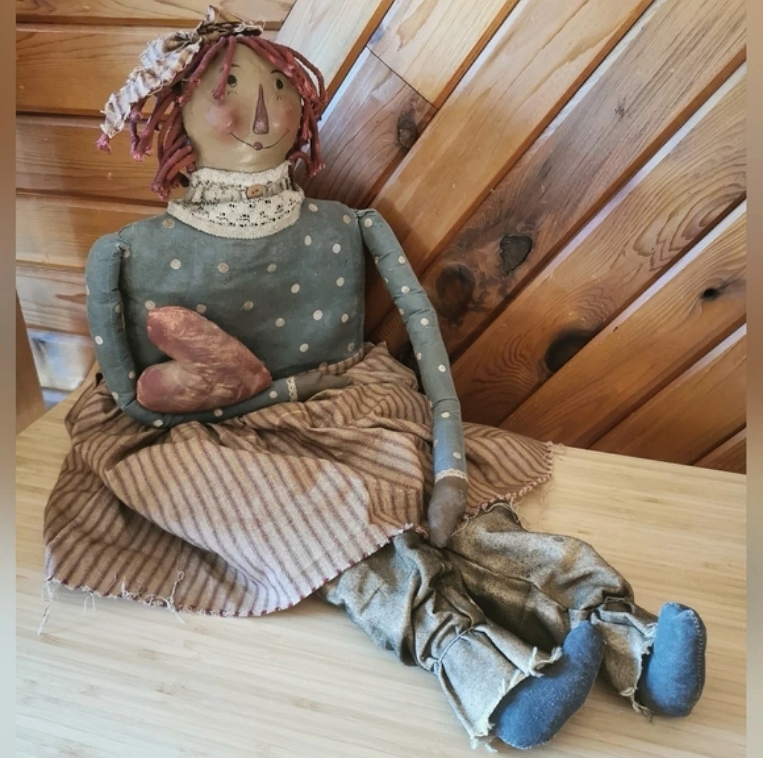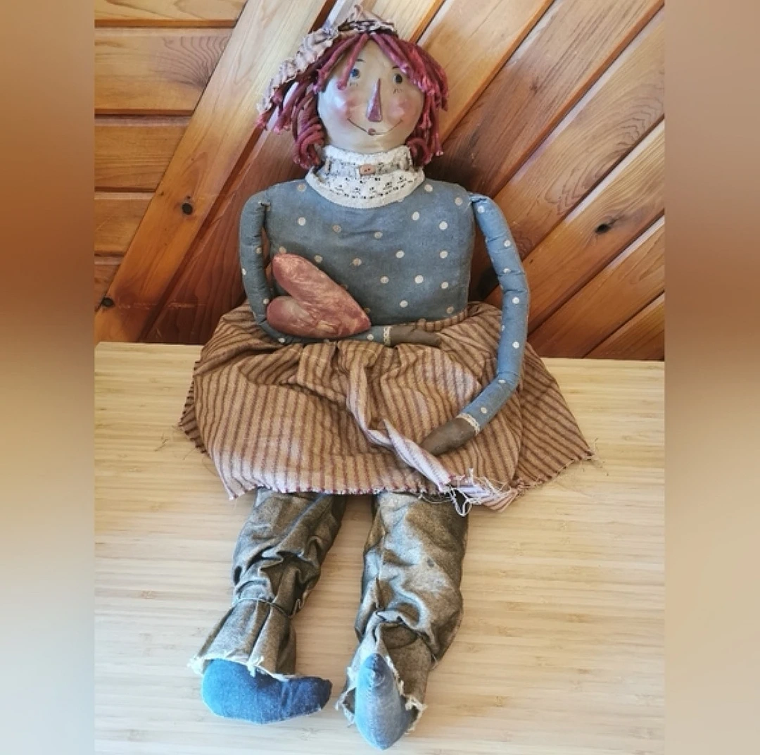 With her long dangling arms and legs, she holds a sweet heart detail that adds to her cozy, country charm. This unique piece is quite large, measuring approximately 22” tall and 10” wide.
