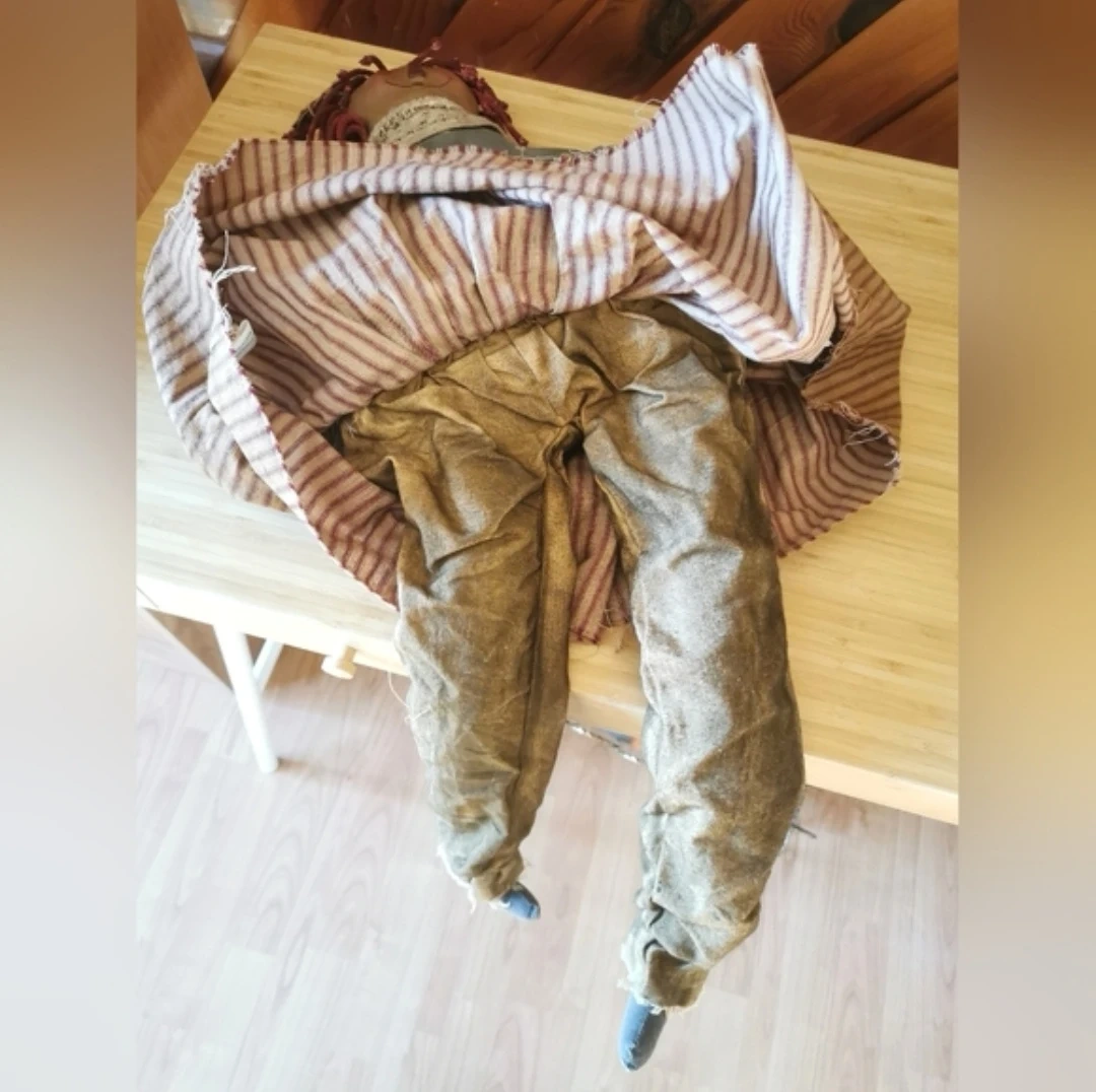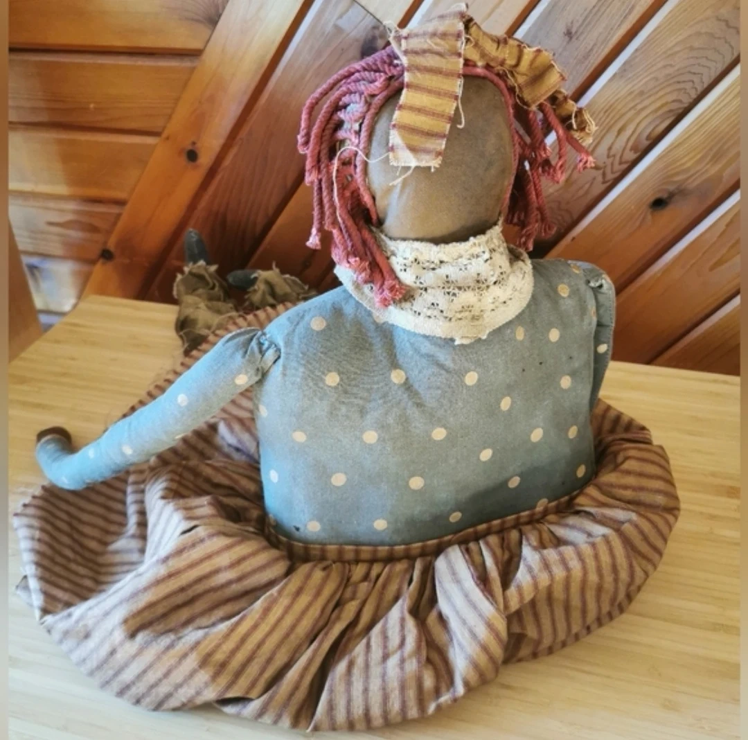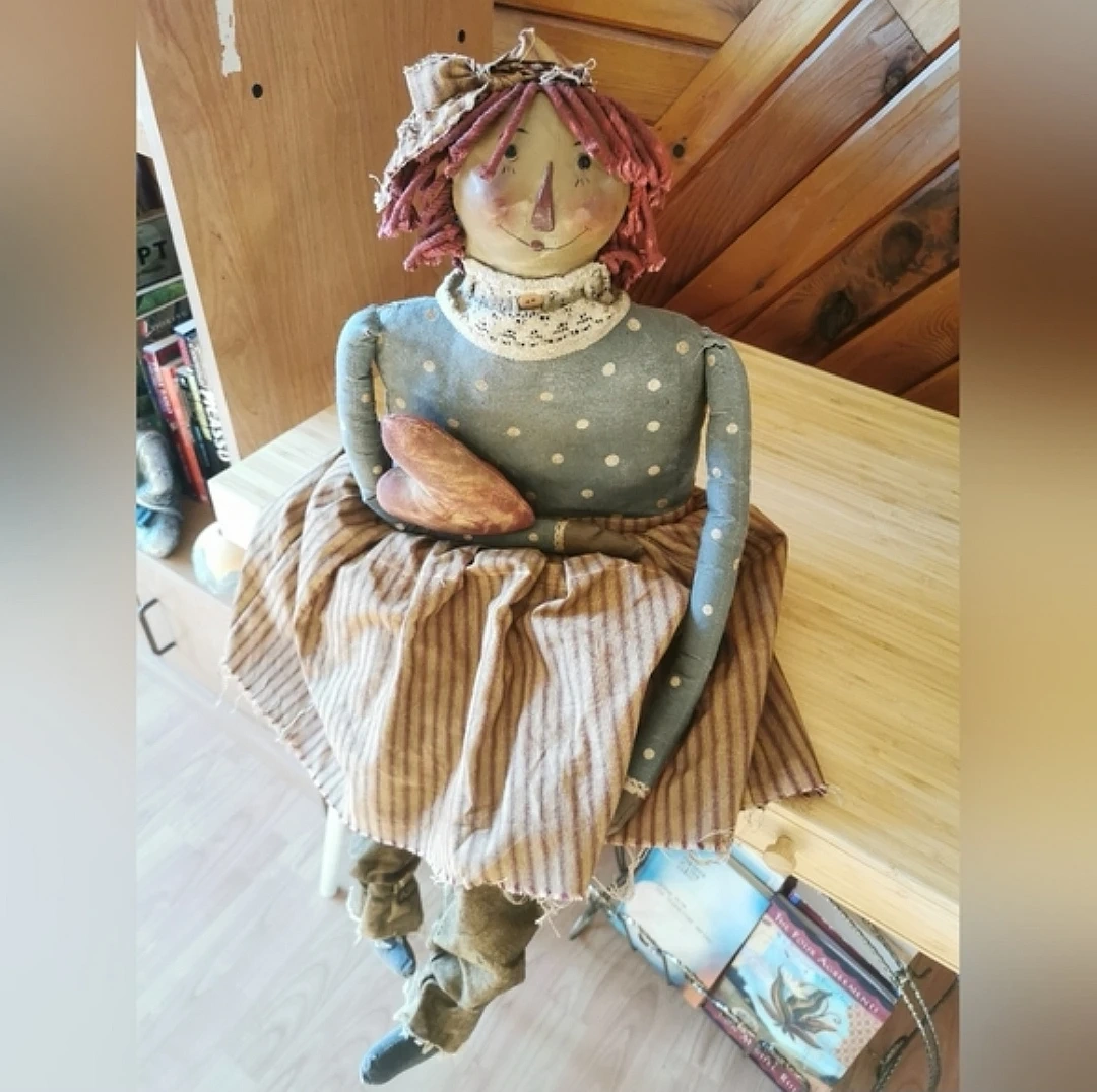 With her long dangling arms and legs, she holds a sweet heart detail that adds to her cozy, country charm. This unique piece is quite large, measuring approximately 22” tall and 10” wide.