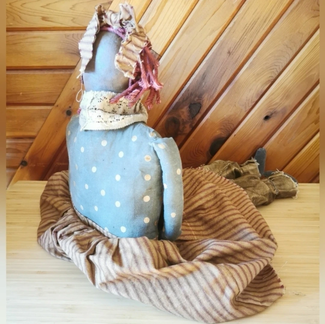 Gorgeous Vintage Handmade Primitive Rag Doll. She features a beautifully hand-painted face with a gentle, kind expression, rosy cheeks, and a soft smile. Her yarn hair, charming bow, and thoughtfully crafted outfit give her a timeless rustic appeal.
