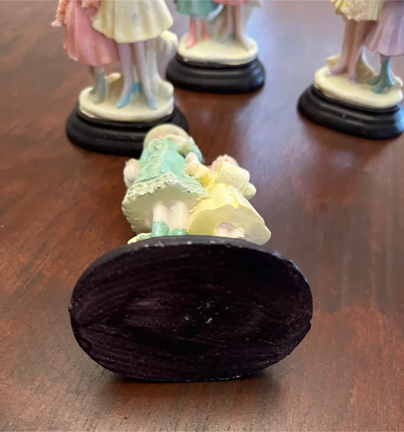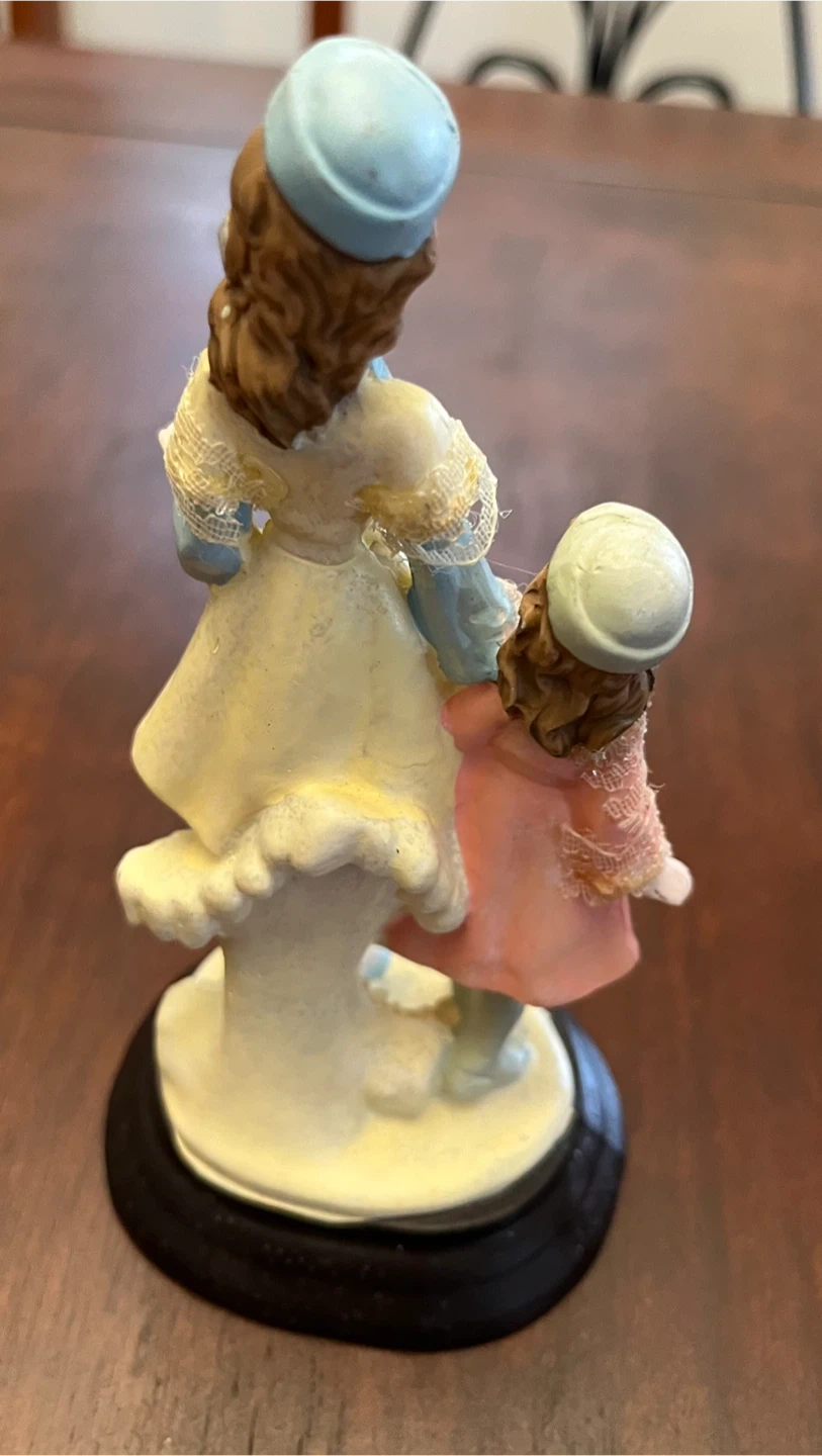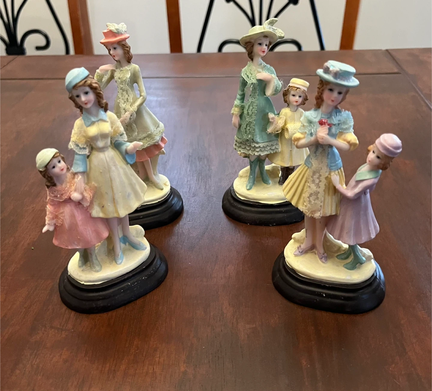 This charming set includes 4 vintage-style figurines of women and children in ornate dresses and hats. Each figurine is mounted on a black base.
