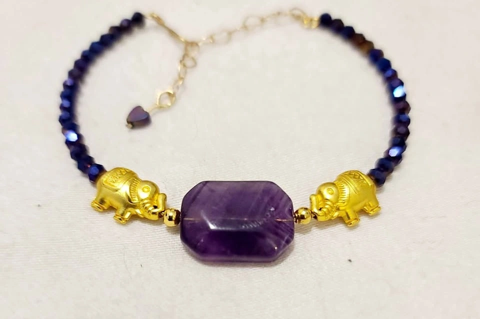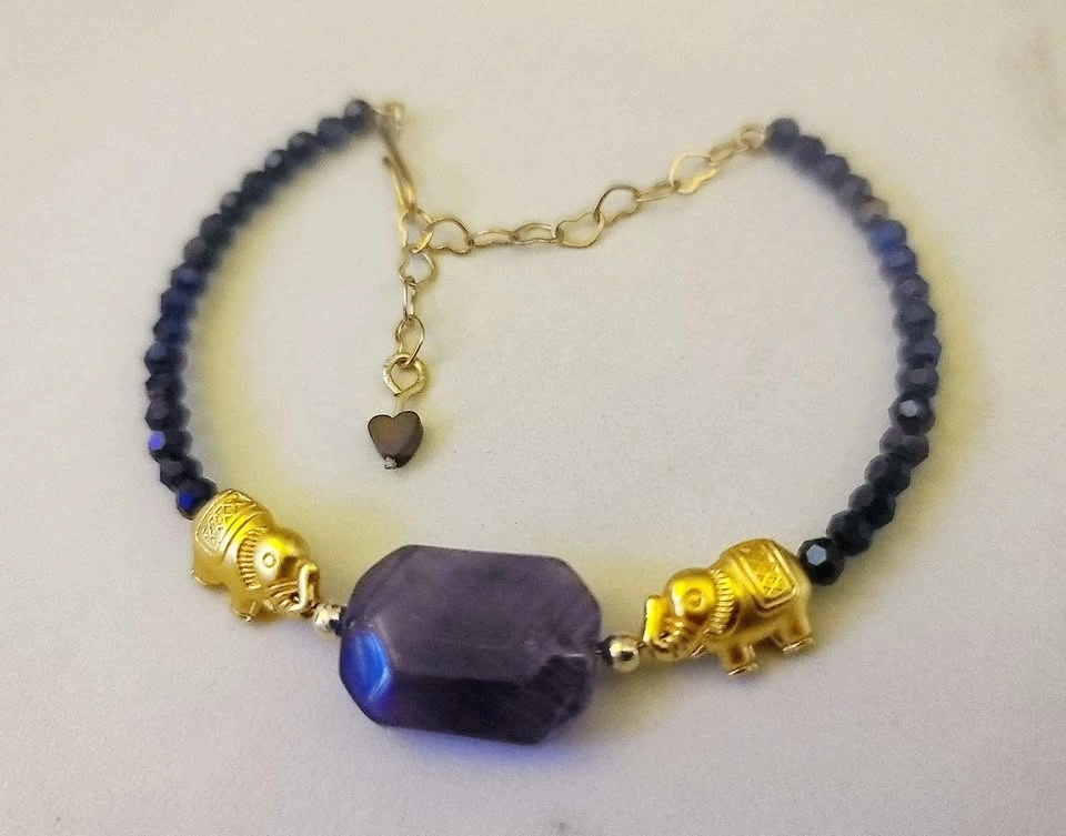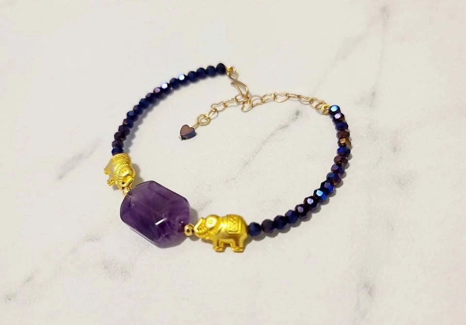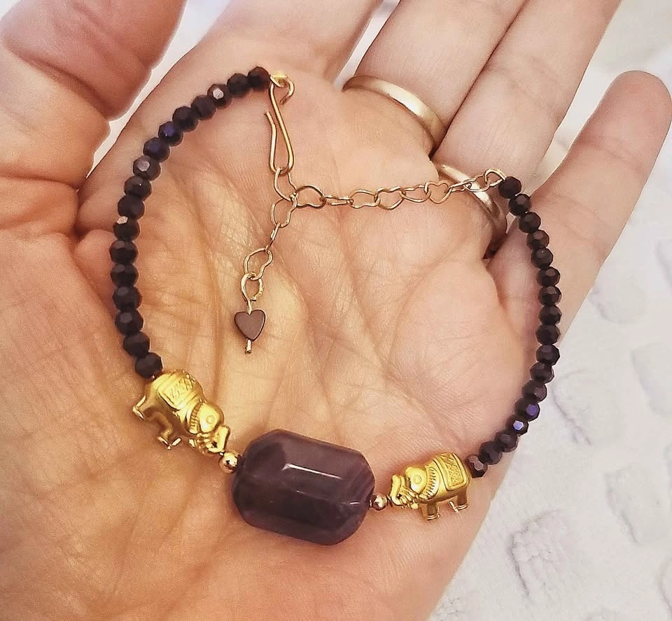 Amethyst is 3/4" X 1/2". Crystals are a deep purple/black, elephants are golden. Bracelet size is adjustable using the golden heart chain and clasp and is created using memory wire.