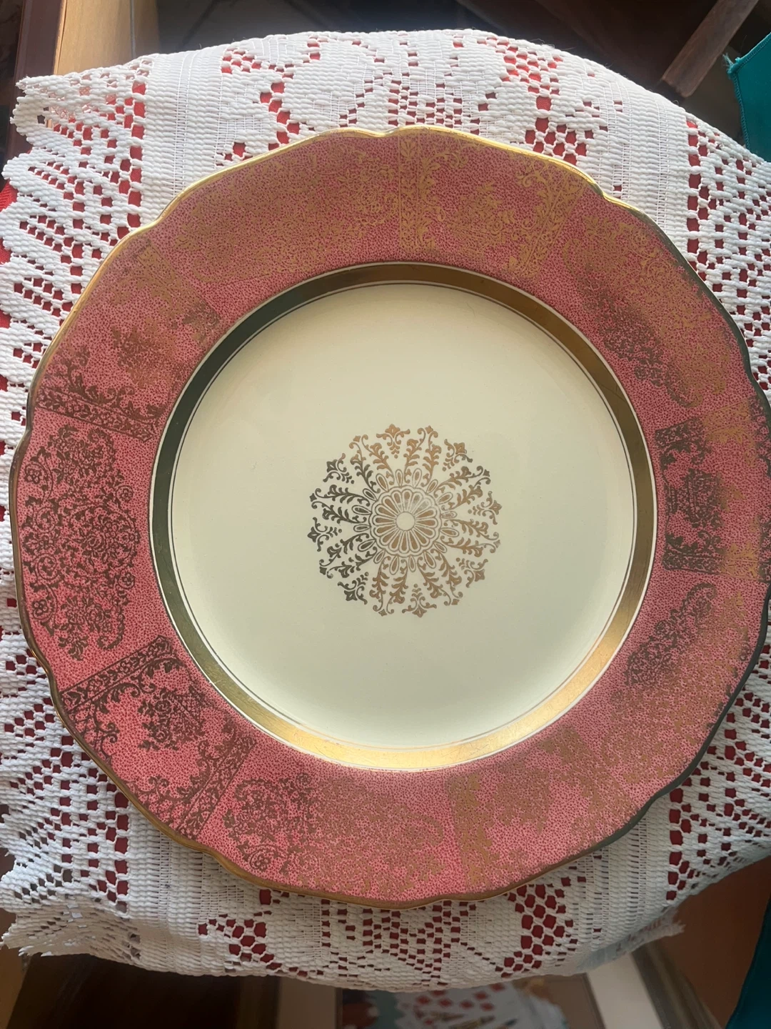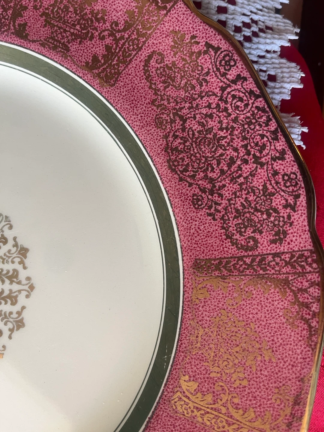 A vintage charger plate from Johnson Brothers, England. It features a decorative pink band with gold accents and a central floral style design.