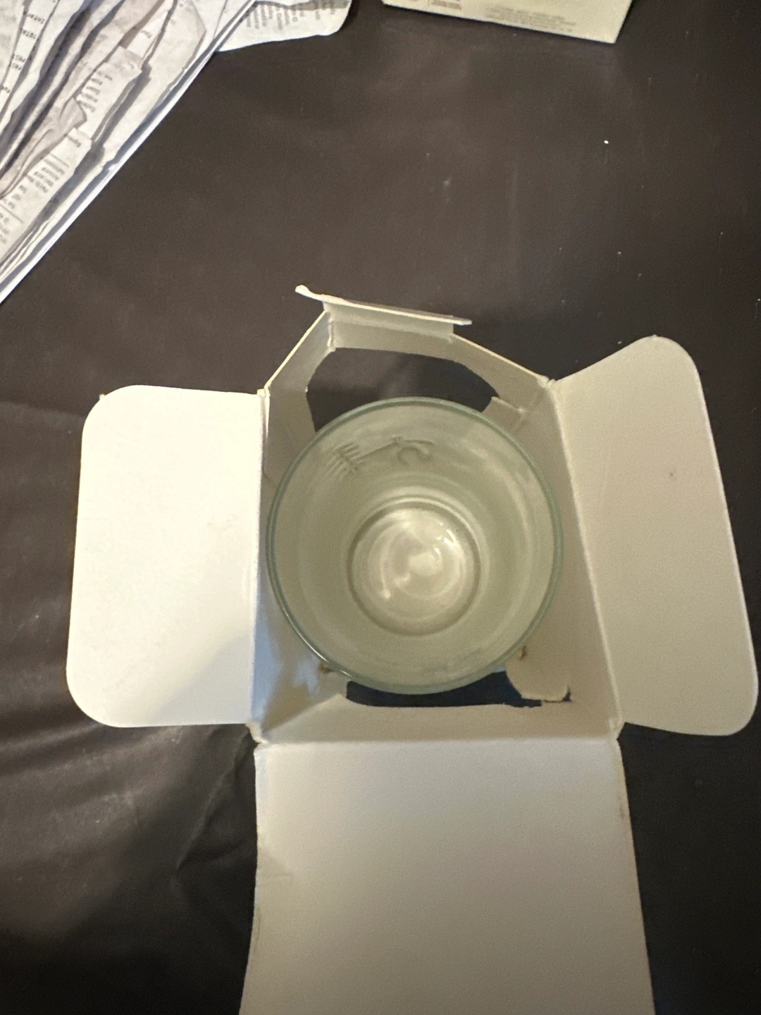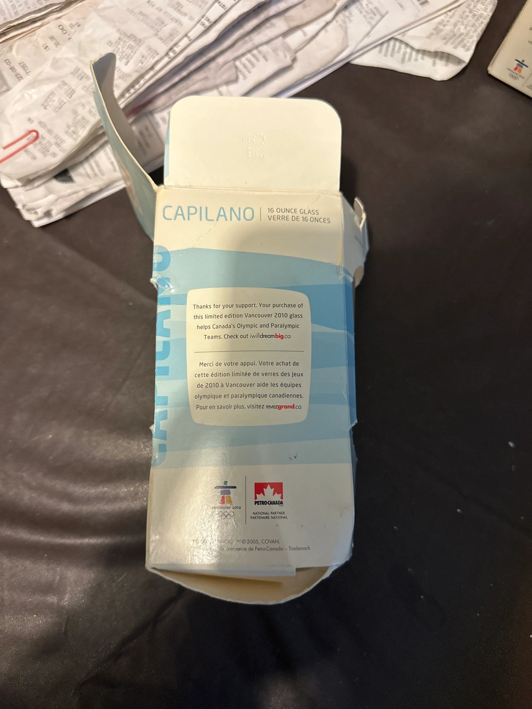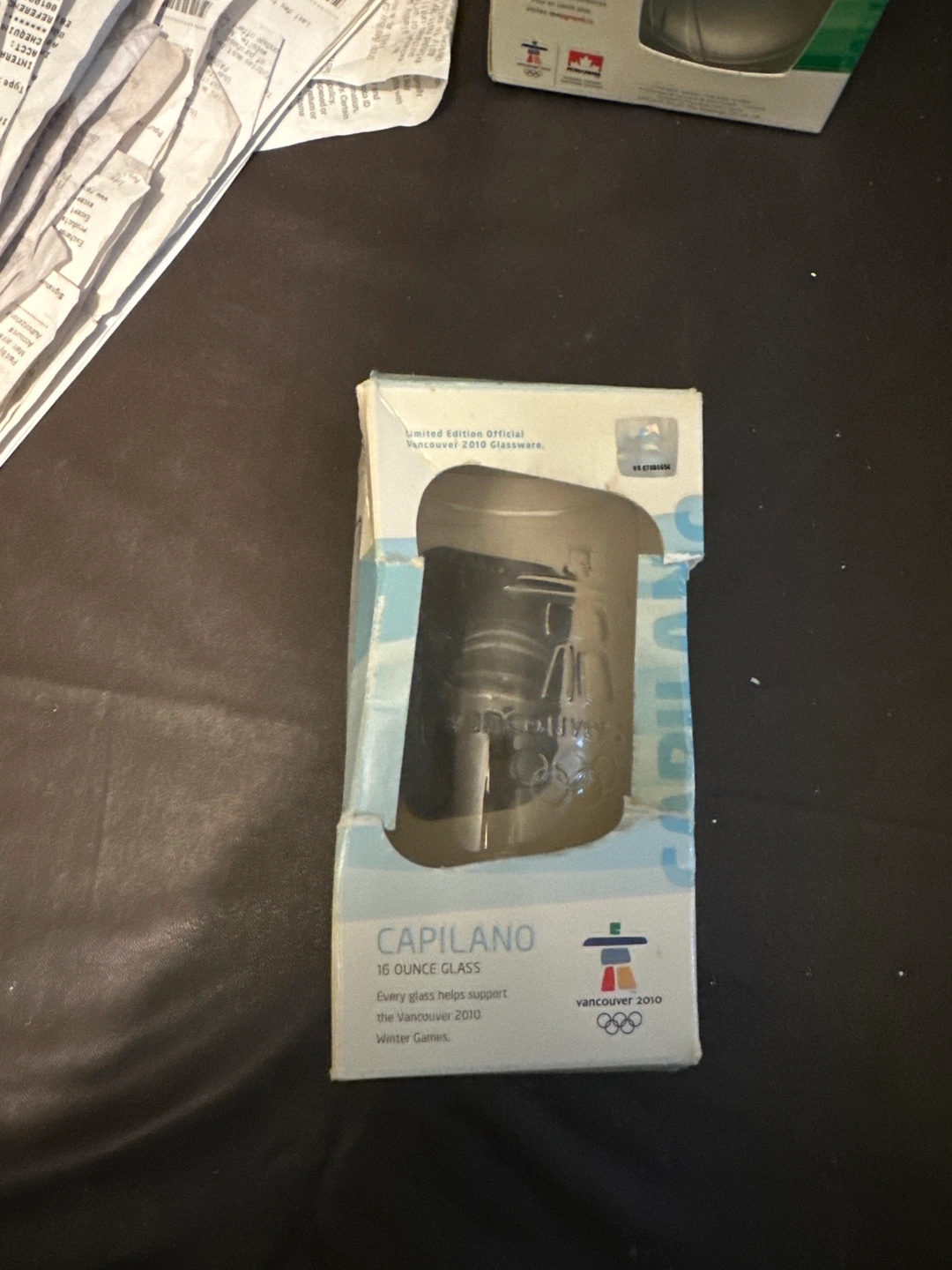 A 16 ounce glass from the 2010 Vancouver Winter Olympics. The glass has the Vancouver 2010 Olympic logo on it. It comes in the original box. The box is a little damaged from storage