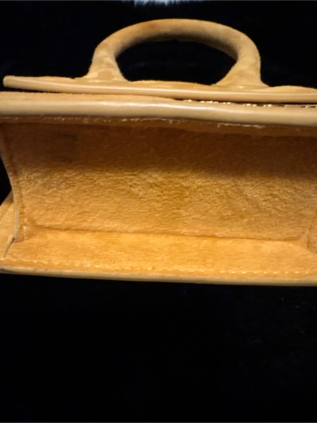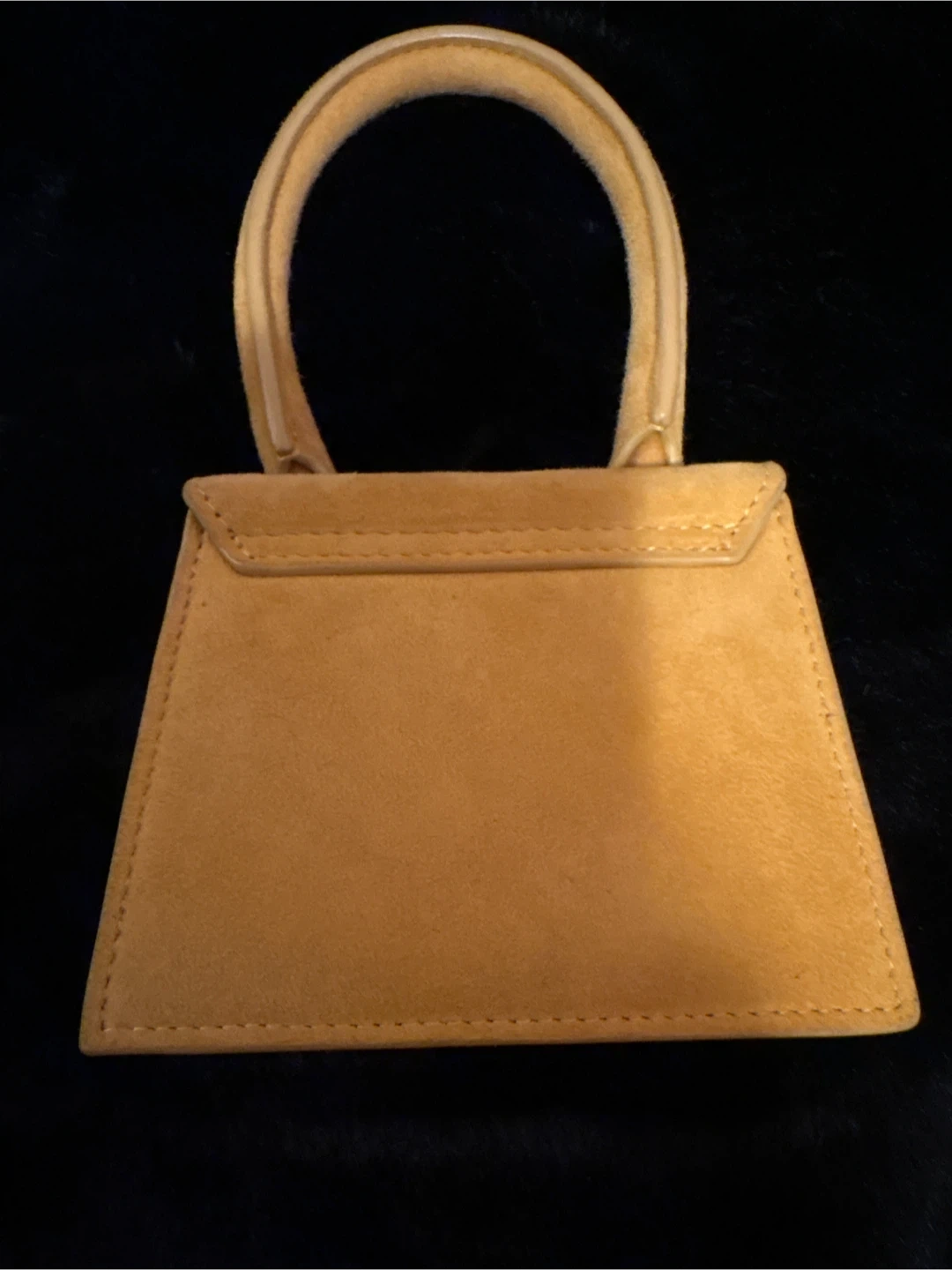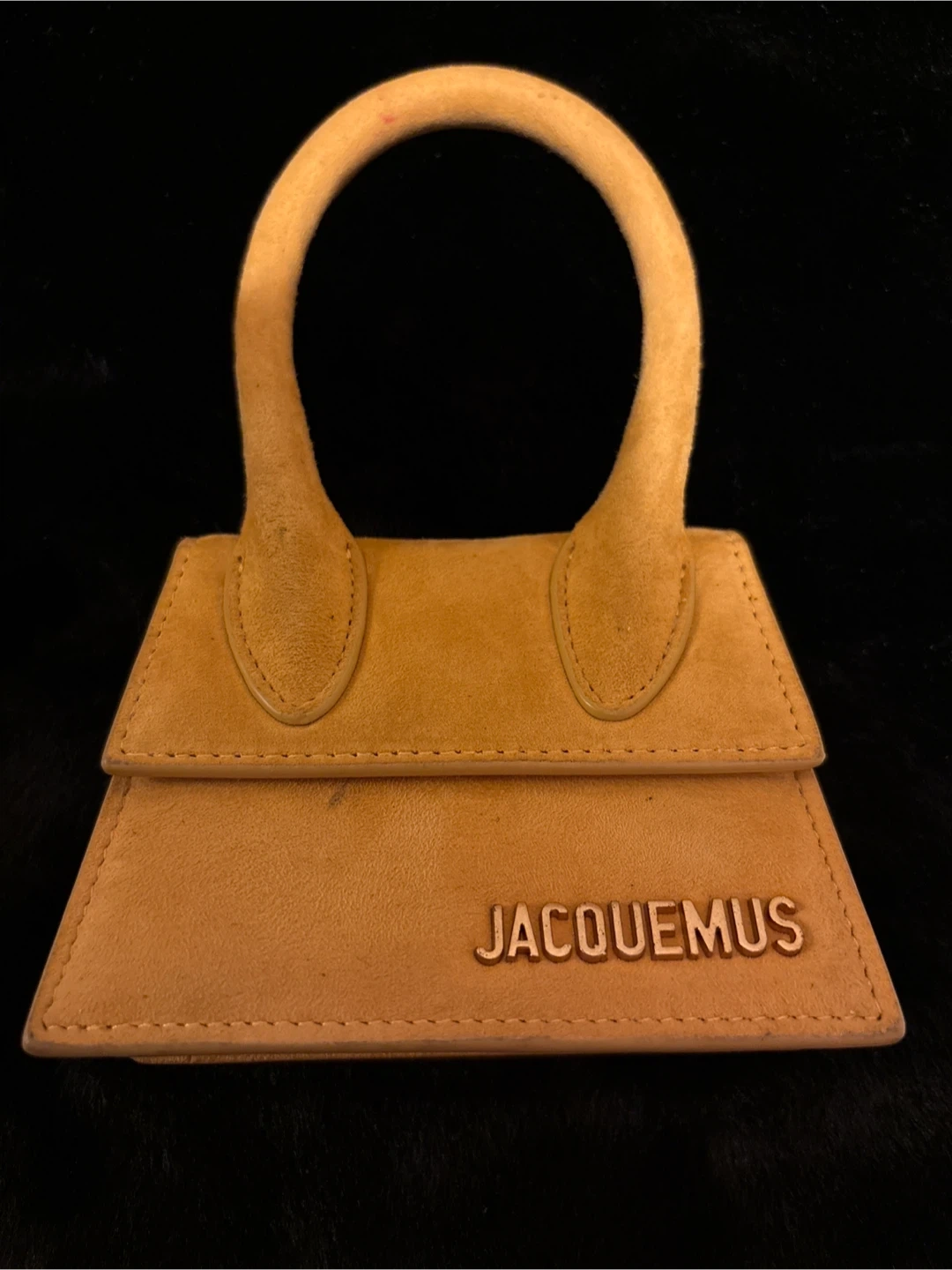 This is a tan suede mini bag by Jacquemus. It features a top handle and a magnetic snap closure. Perfect for carrying small essentials! The only thing I don’t have the strap.