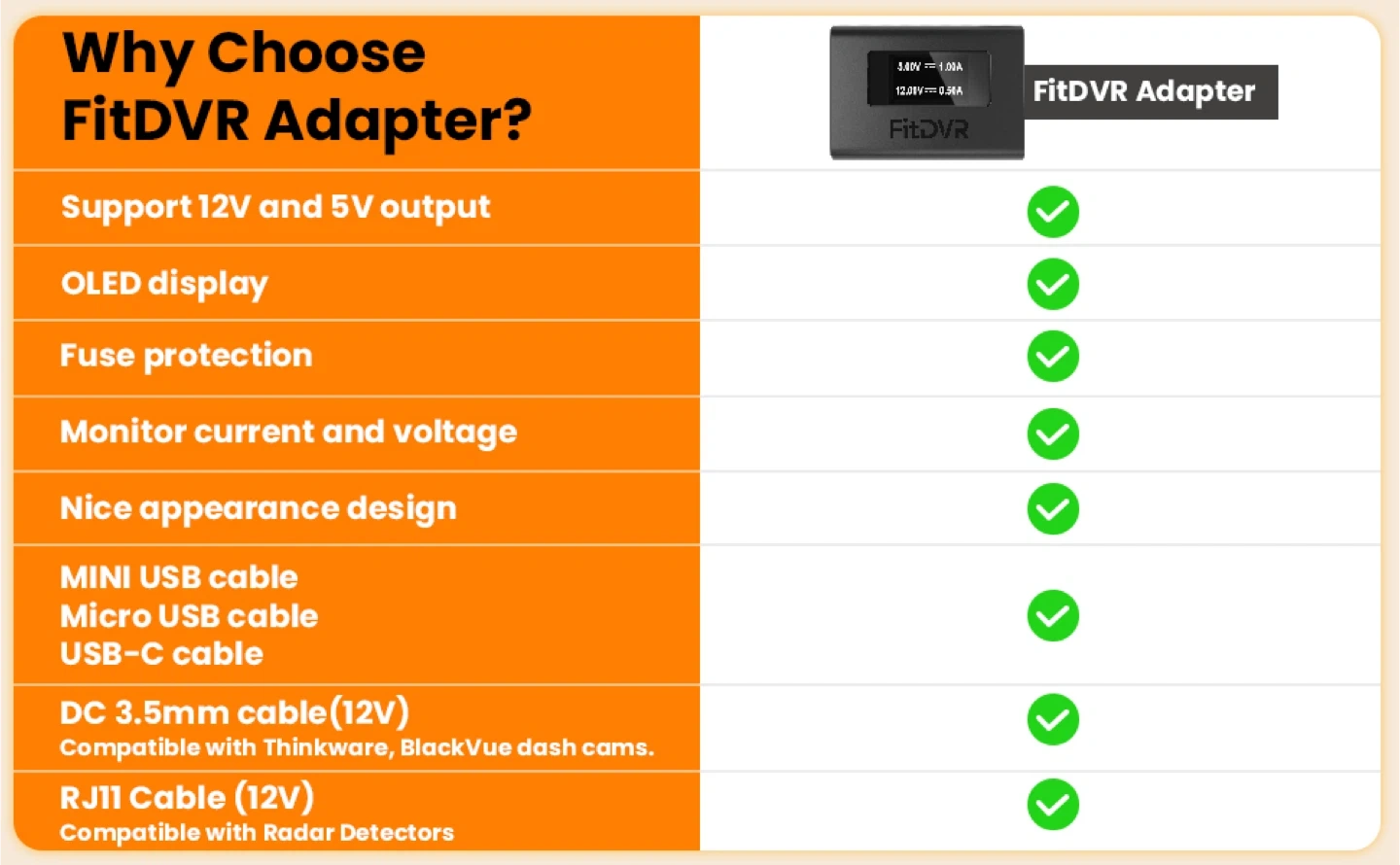 FitDVR Dash Cam Power Adapter for Rearview Mirror