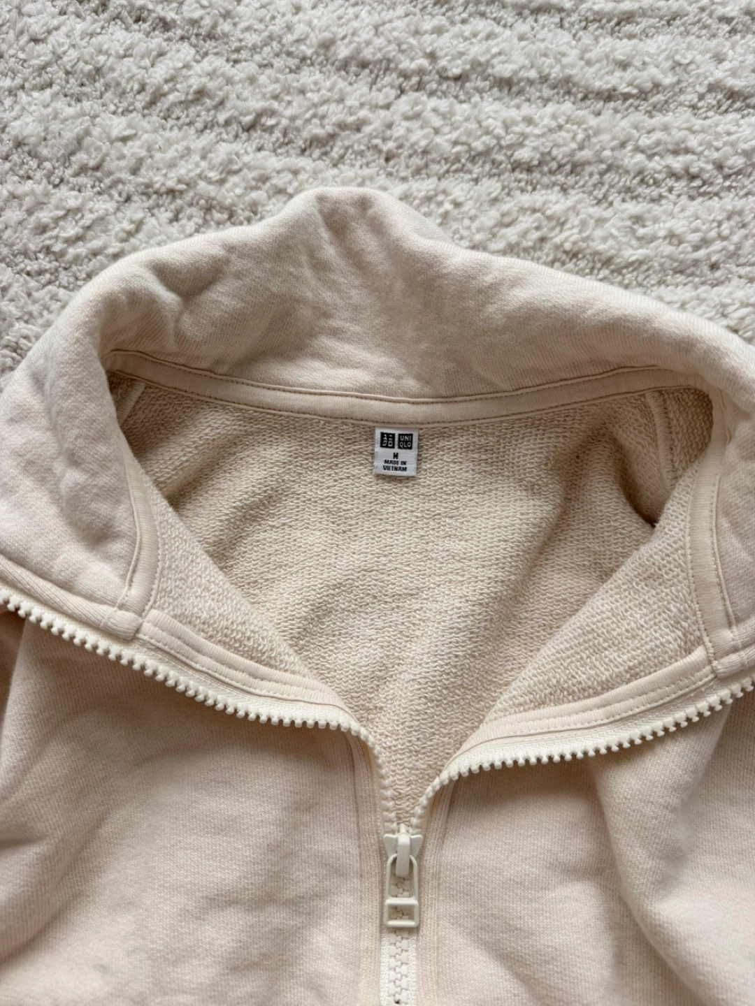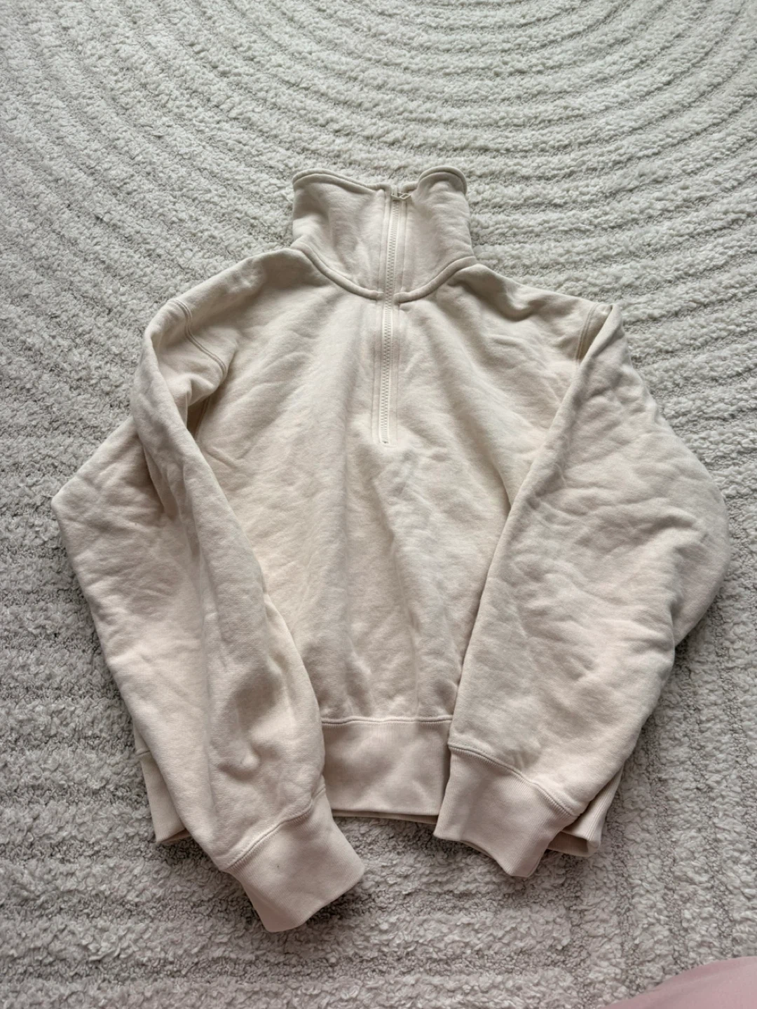 This is a beige Uniqlo half-zip sweatshirt. It's made from a comfortable, soft material. The high collar and quarter-zip design make it a versatile piece for cooler weather.
