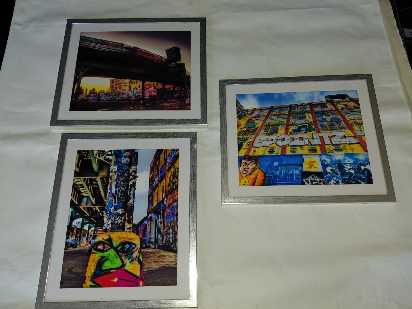 This collection features seven framed art prints. Four prints showcase New York City skylines and bridges, while three display vibrant graffiti art. They're perfect for adding urban flair to any space!. Selling sets of 10 original photos of historic NYC pregramed photos. The original Art work is for sake also at a higher price point but negotiable. This guy is the next best thing keep an eye out for this Artist!.
