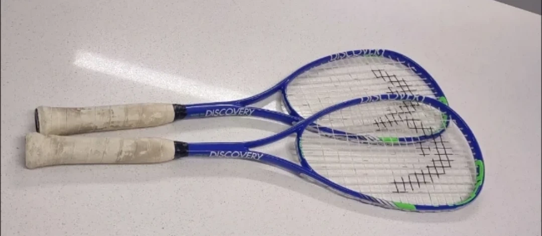 Two blue Discovery racquets are available. They're great for beginner players. The frames are blue with green accents on the head.